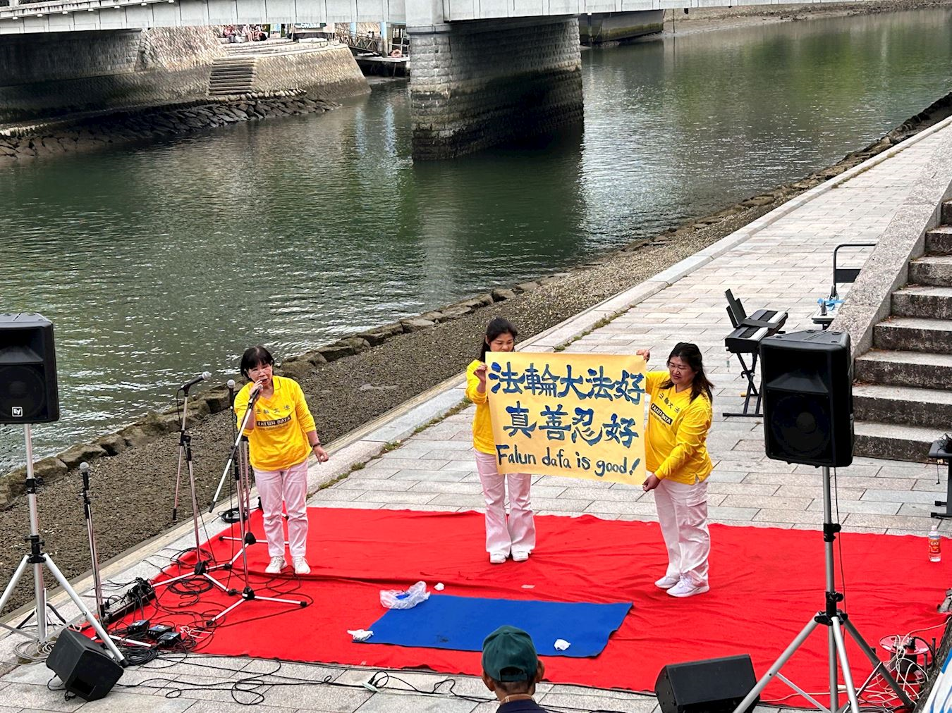 法轮功学员现场演示了配乐书法。配乐是二胡独奏“春”,书法作品是“法轮大法好、真善忍好”。当时有很多欧美的观光客也在观看,书写完毕时他们都问“法轮大法好、真善忍好”怎么念,在场的法轮功学员就教他们中文的发音,观众也跟着念“法轮大法好、真善忍好”,场面令人感动。