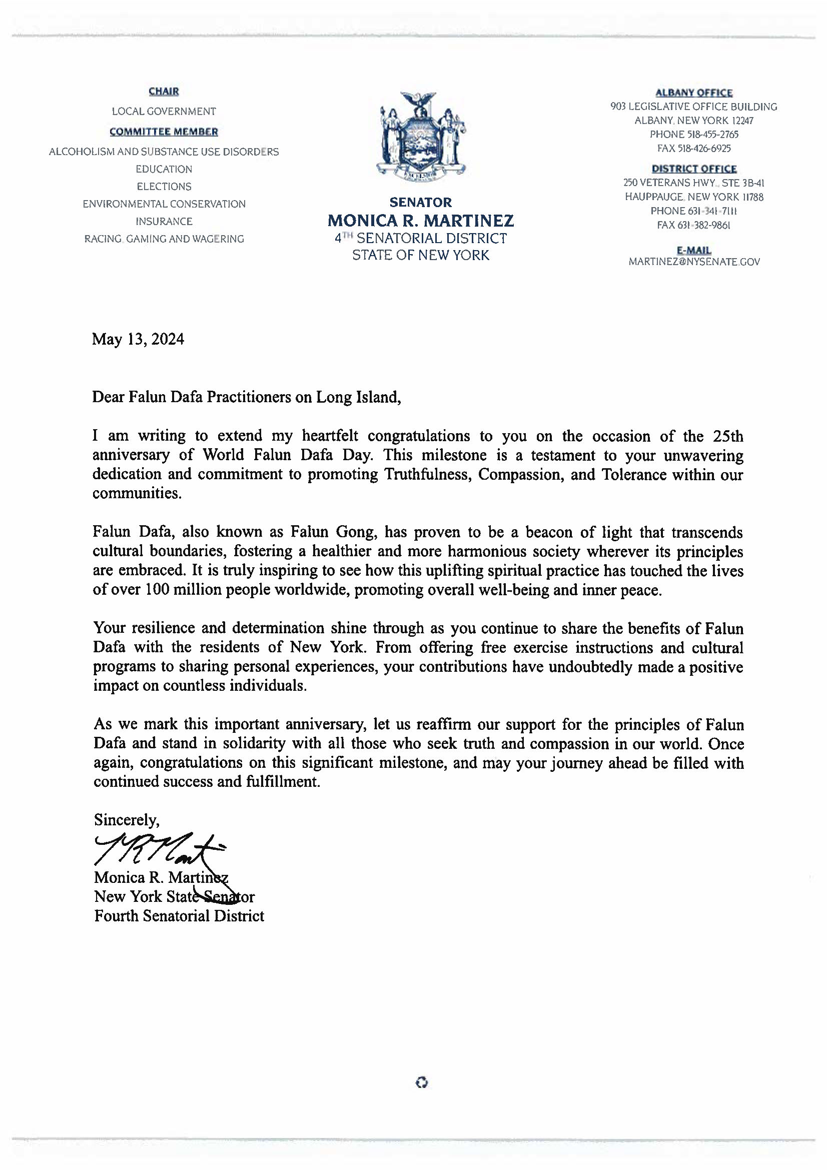 纽约州第4选区参议员、地方政府委员会主席莫妮卡‧马丁内斯(Monica R. Martinez)发来贺信,祝贺法轮大法日。