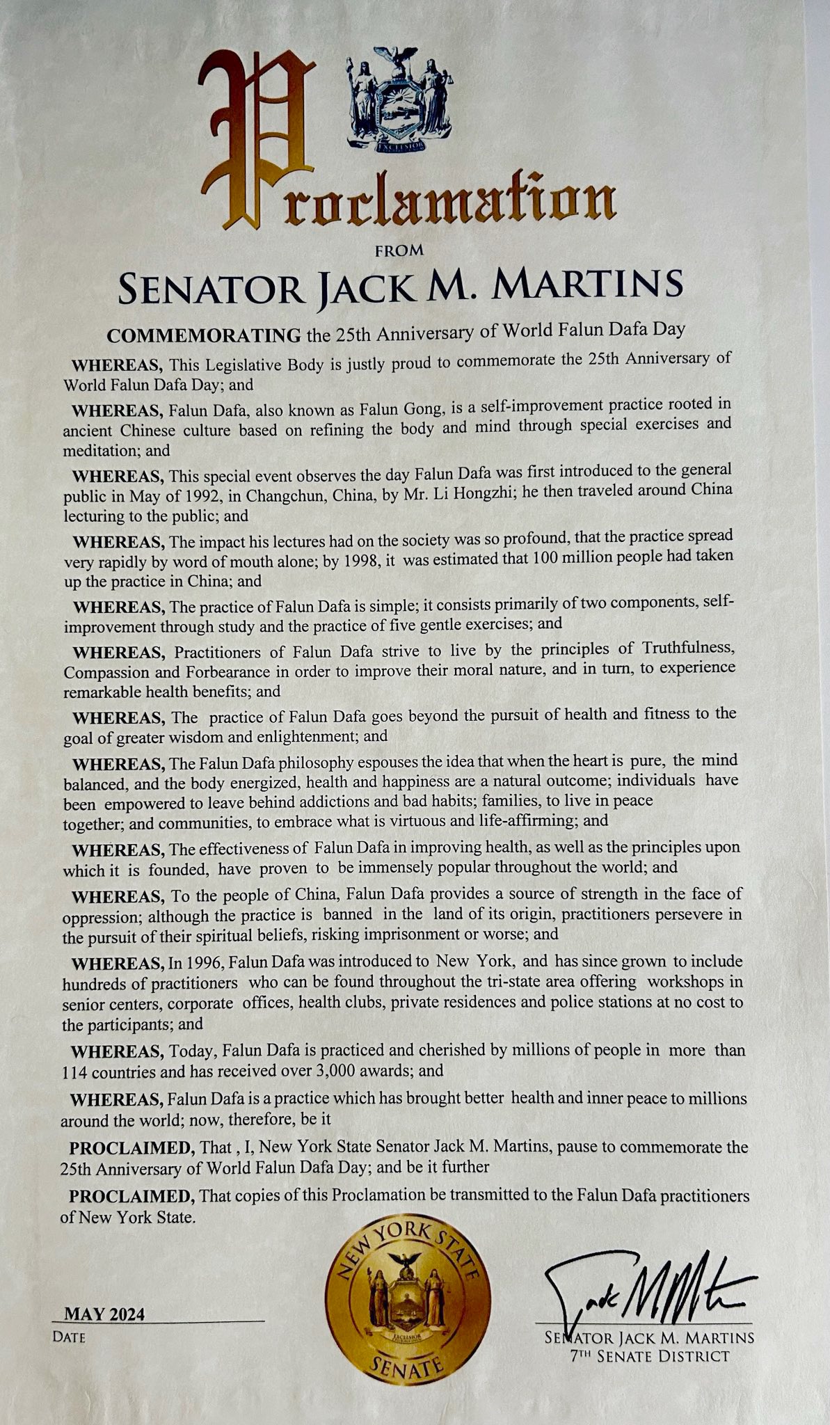 因此,我,纽约州参议员杰克·马丁斯(Jack M.Martins),发此褒奖,祝贺世界法轮大法日二十五周年;并且将本公告副本转发给纽约州的法轮大法修炼者。”