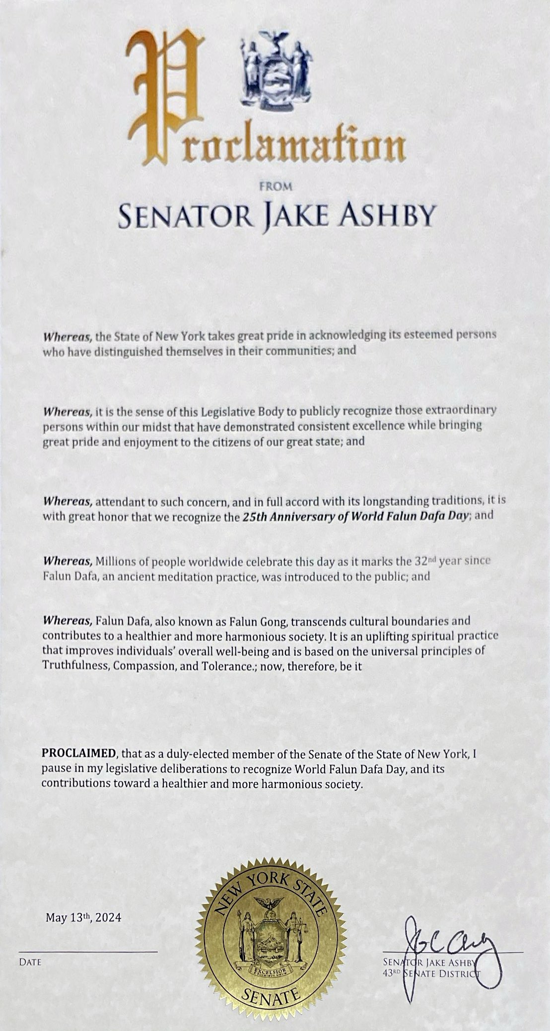 纽约州第43选区参议员阿什比:褒奖法轮大法对促进社会更祥和健康发展的贡献