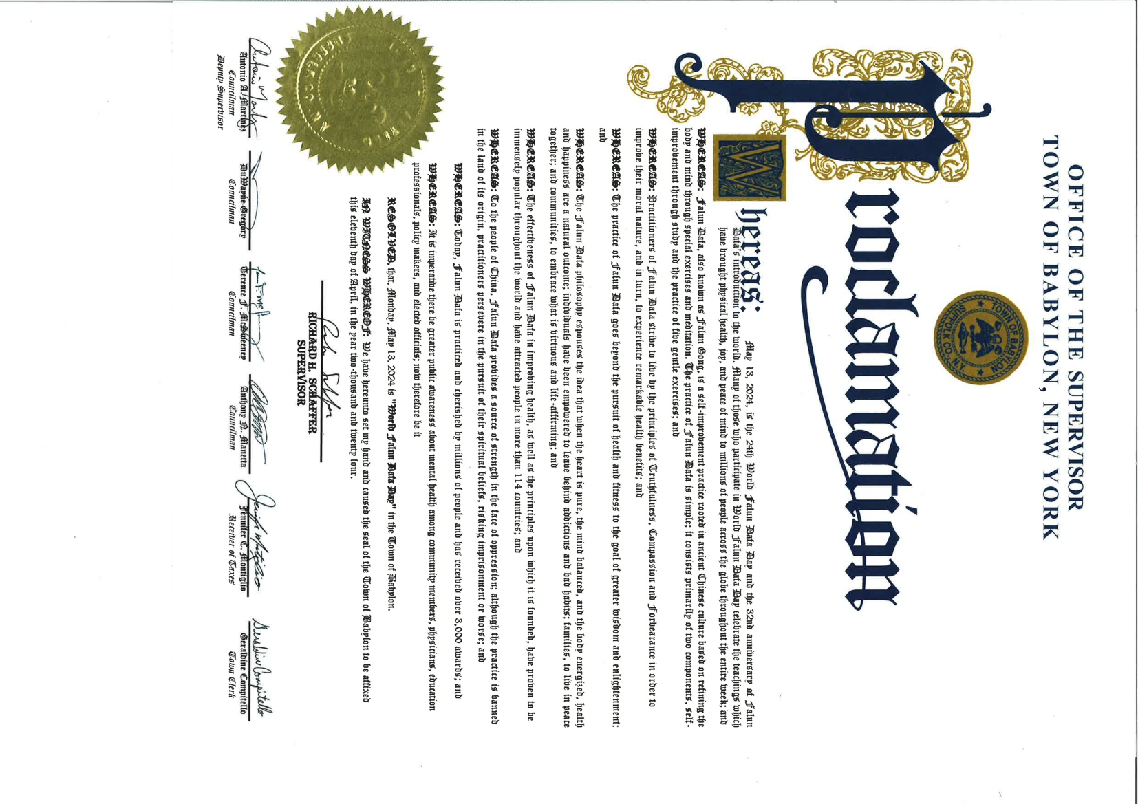 纽约长岛巴比伦镇(Town of Baylon)包括镇长里奇·谢弗(Rich Schaffer)、副镇长安东尼奥·A·马丁内斯(Antonio A. Martinez)、议员特伦斯·麦克斯威尼(Terence McSweeney)、安东尼·马内塔(Anthony Manetta)和杜韦恩·格雷戈里(DuWayne Gregory)等在内的全部七位镇政府官员,褒奖二零二四年五月十三日是巴比伦镇的世界法轮大法日。