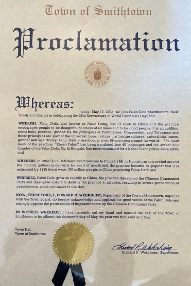 长岛史密斯敦镇(Town of Smithtown)镇长爱德华·韦尔海姆(Edward R:Wehrheim)颁发褒奖,为法轮大法的杰出奉献叫好;并强烈反对中共迫害法轮功学员。