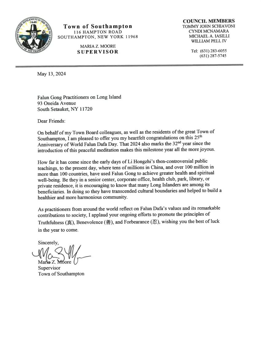 长岛南安普敦镇(Town of Southampton)镇长玛丽亚·摩尔(Maria Z. Moore)也发来贺信,赞扬学员们为弘扬 “真、善、忍”所做的不懈努力。 贺信中说