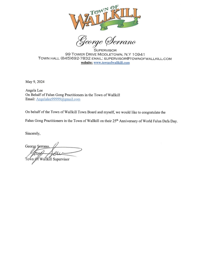 沃尔基尔镇镇长乔治·塞拉诺 (George Serrano) 发来贺信,表示:“我们代表沃尔基尔镇镇委会和我本人向沃尔基尔镇法轮功学员祝贺。庆祝世界法轮大法日二十五周年。”
