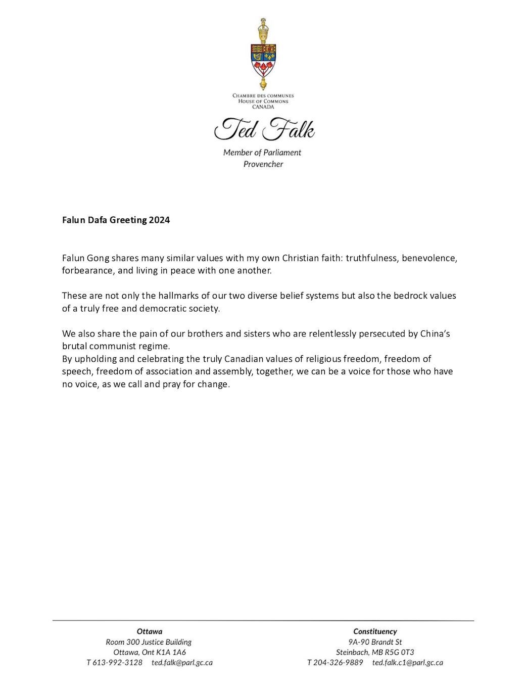 普罗旺彻区国会议员泰德·福克(Ted Falk)在贺信中说:法轮功与我自己的基督教信仰有许多相似的价值观:比如真,善,忍、与他人和平相处。
