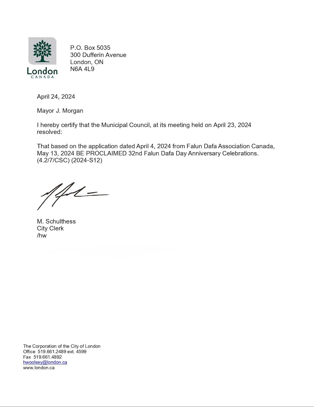 根据加拿大法轮大法协会在二零二四年四月四日递交的申请,宣布我市将于二零二四年五月十三日庆祝法轮大法弘传三十二周年的纪念日。