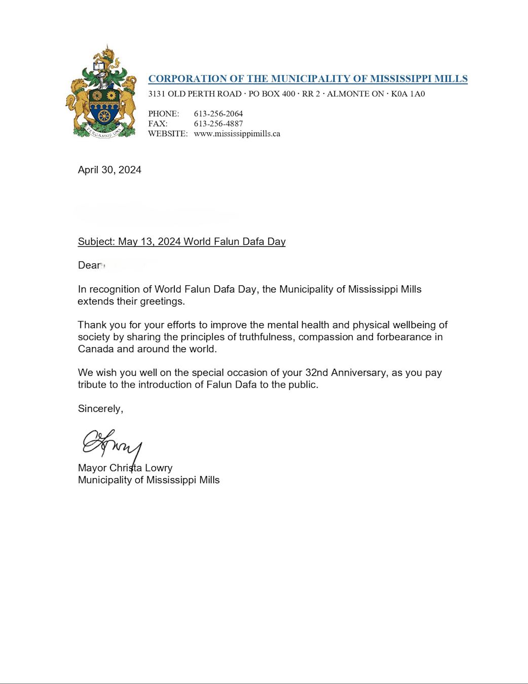 斯普林沃特镇长珍妮弗 • 考夫林(Jennifer Coughlin)在贺信说:我谨代表斯普林沃特镇祝贺法轮大法弘传三十二周年,以及加拿大法轮大法学员对小区做出的贡献。