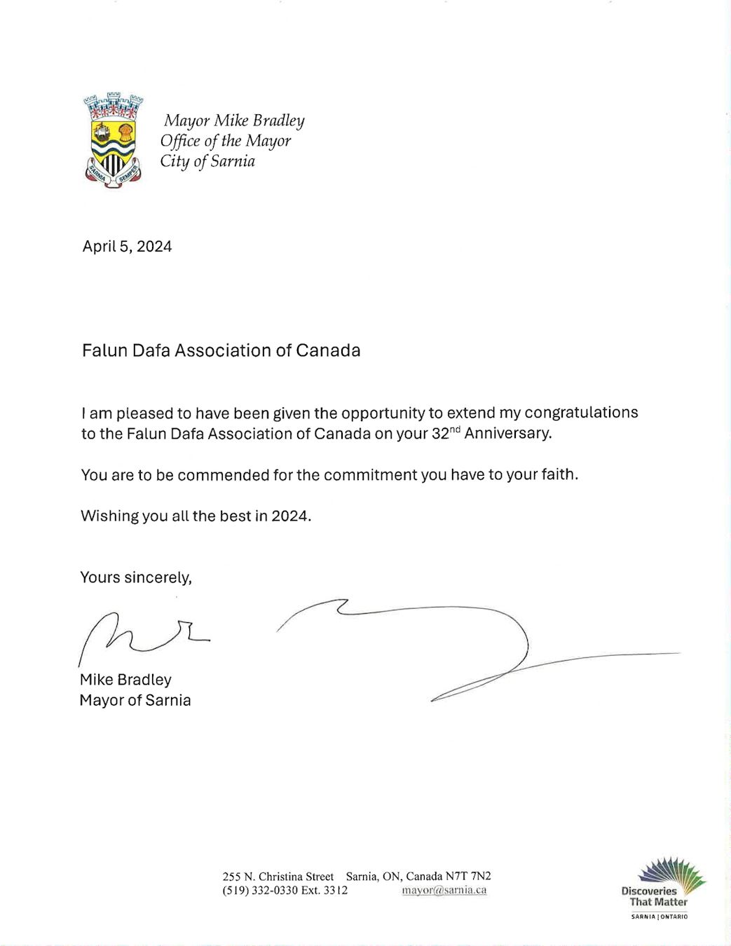 萨尼亚市市长麦可‧布莱德利(Mike Bradley)在贺信中说:我非常高兴能有机会在法轮大法传世三十二周年之际,向加拿大法轮大法学会转达我的祝贺。
