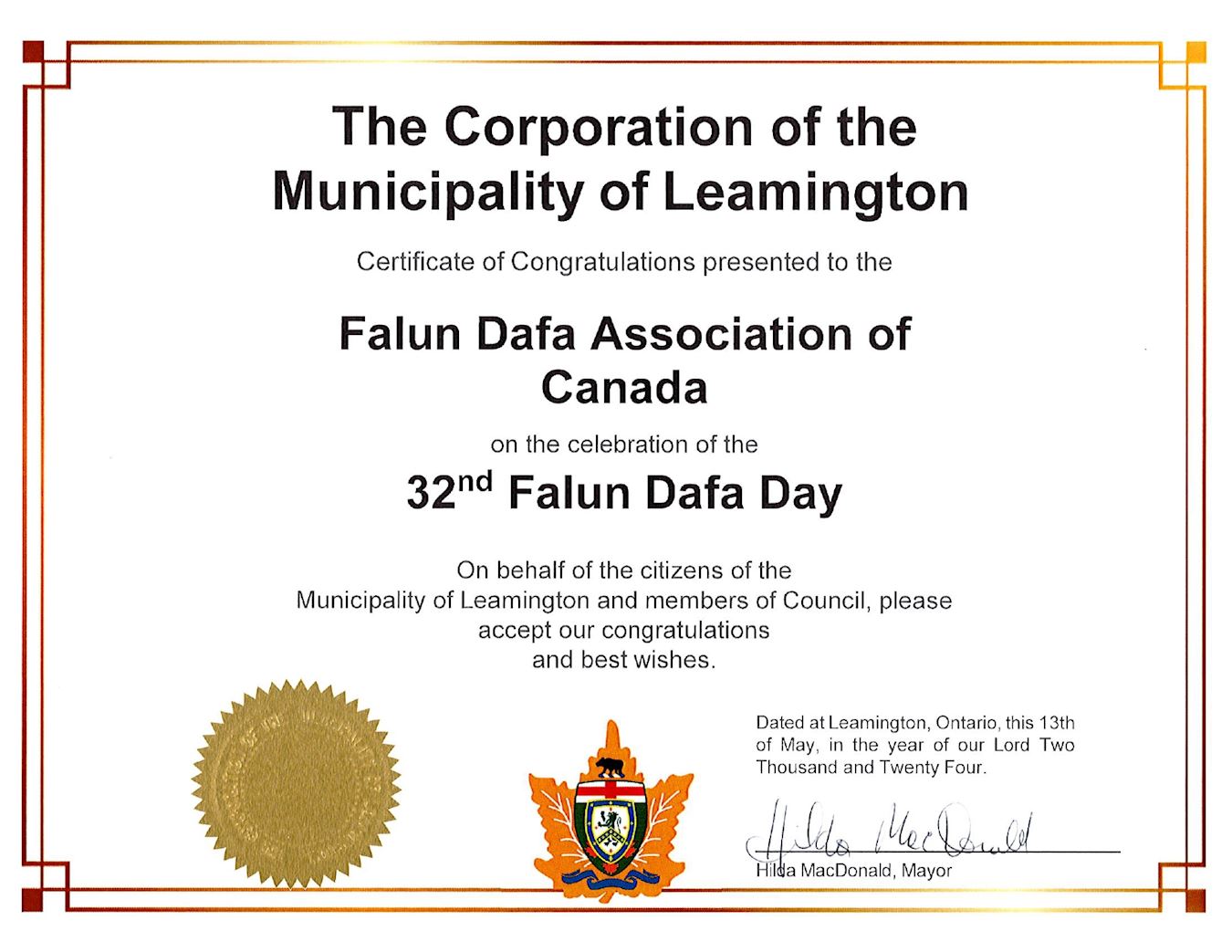 利明顿市市长希尔达·麦克唐纳 (Hilda MacDonald)发祝贺证书,证书中说:谨代表利明顿市的市民和市议会成员,向加拿大法轮大法学会庆祝第三十二届法轮大法日,请接受我们的祝贺和最美好的祝愿。