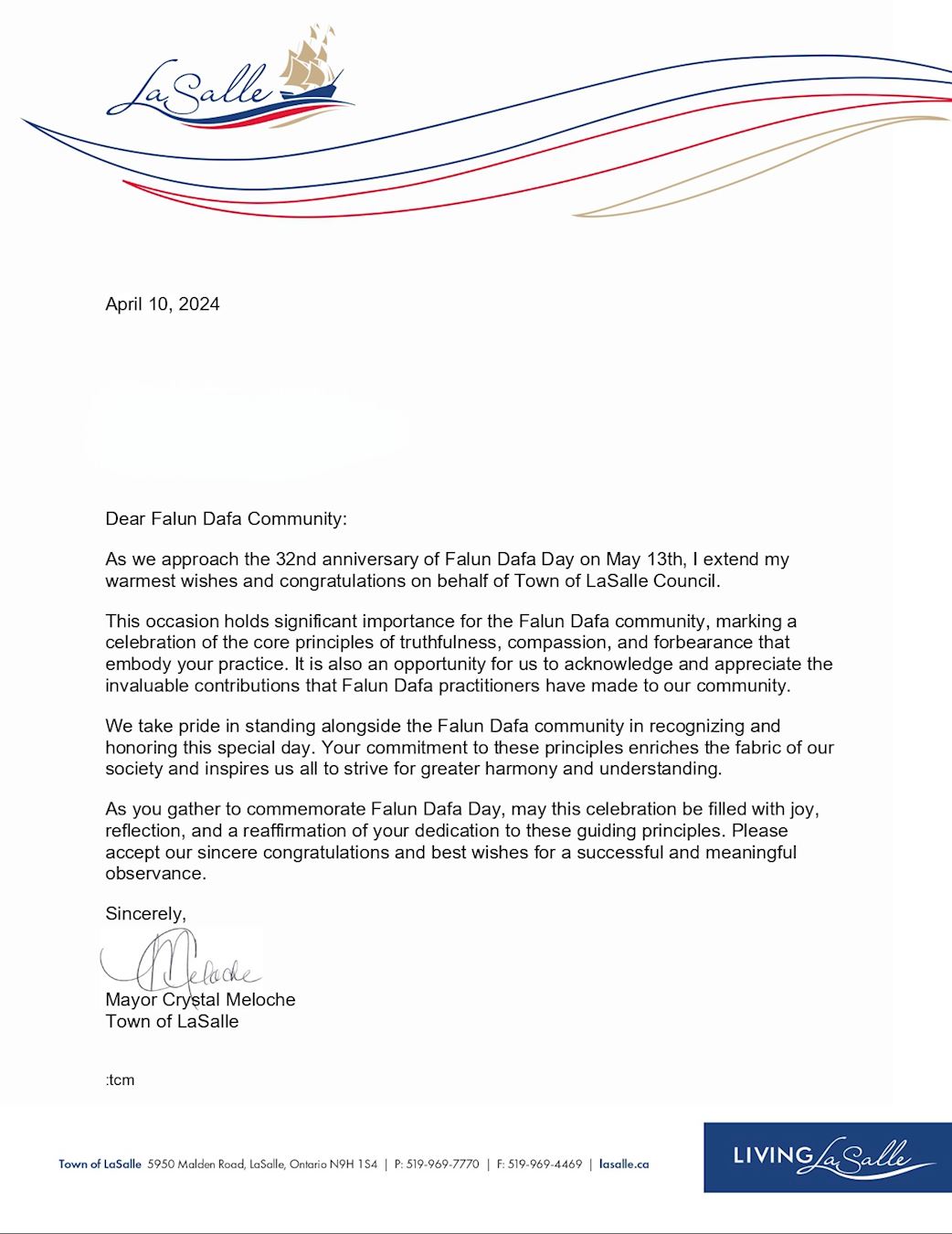 萨尔镇市长克里斯托·梅洛切(Crystal Meloche)在贺信中说:在五月十三日世界法轮大法日,也就是法轮大法弘传三十二周年纪念日即将到来之际,我谨代表拉萨尔(LaSalle)镇议会向全体法轮功学员致以最热烈的祝福和祝贺。