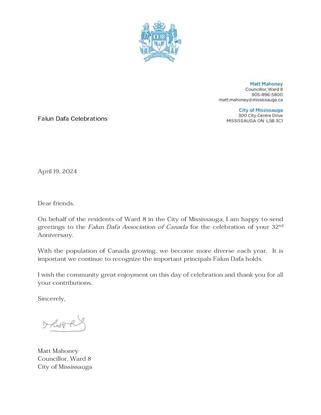 密西沙加市第八选区市议员马奥尼(Matt Mahoney)在贺信中说:亲爱的朋友们,我很高兴代表第八选区的市民,祝贺法轮大法传世三十二周年。