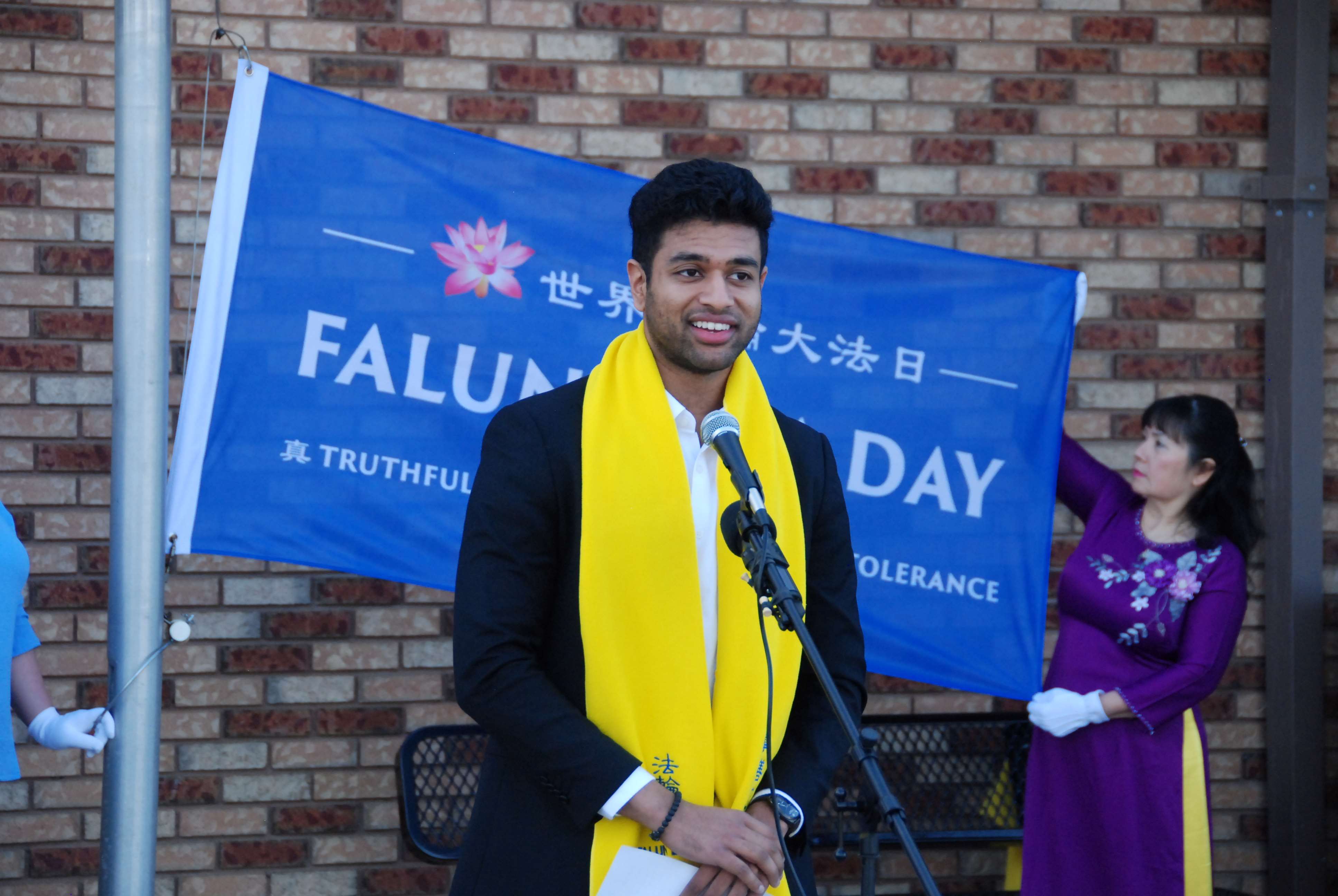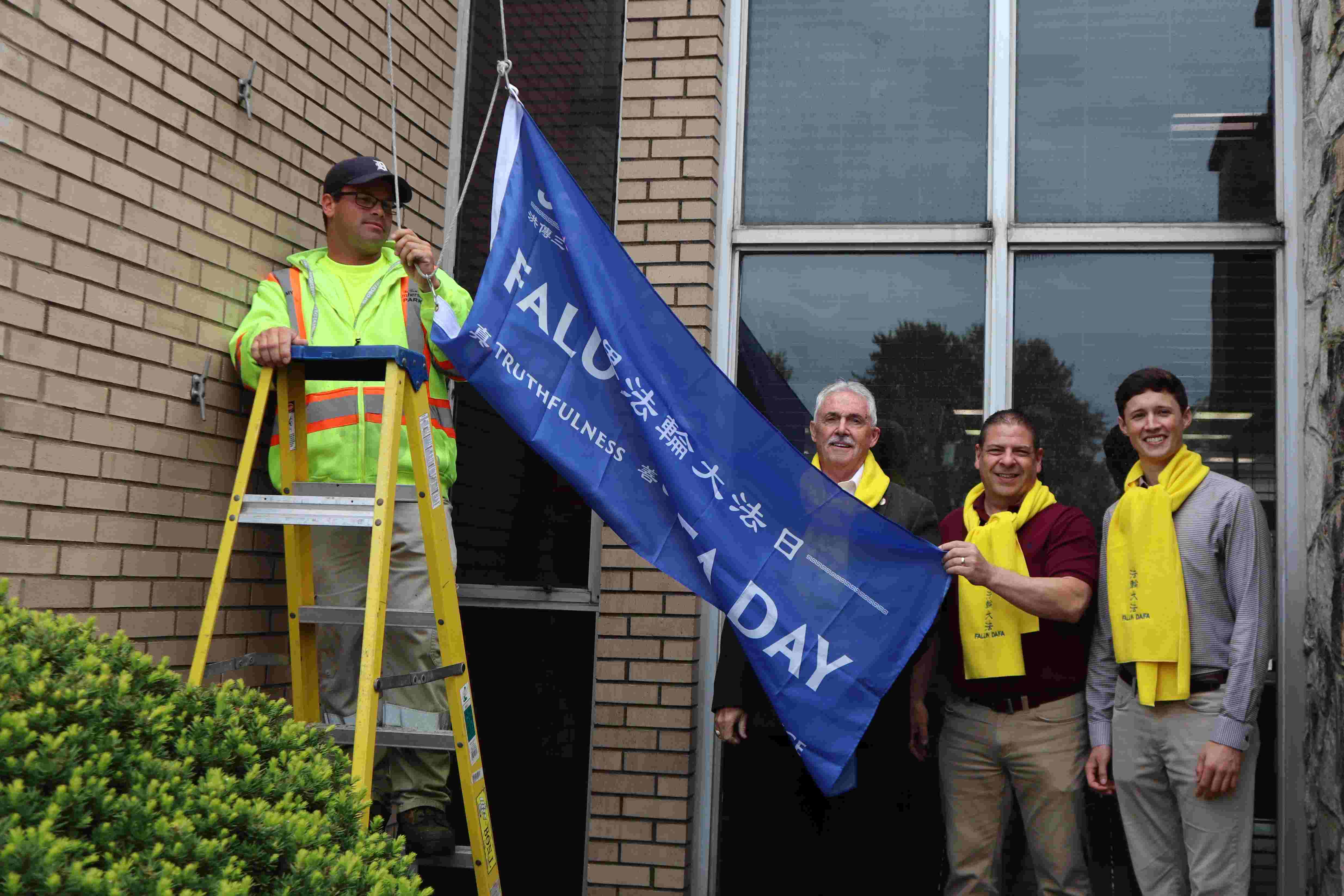 “在我们今天升起这面旗帜的同时,让我们庆祝法轮大法的原则以及其修炼者对我们社区的贡献。愿这面旗帜成为大家团结、理解和友善的象征,我们和所有与之共鸣的人站在一起。”