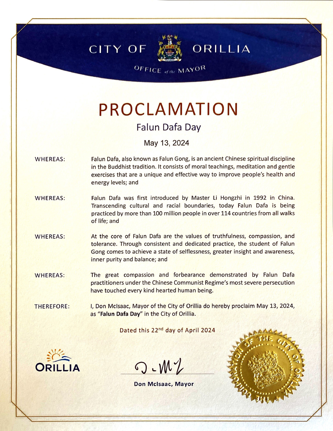因此,本人,奥里利亚市市长唐·麦克尔萨克,宣布二零二四年五月十三日为我市的法轮大法日。