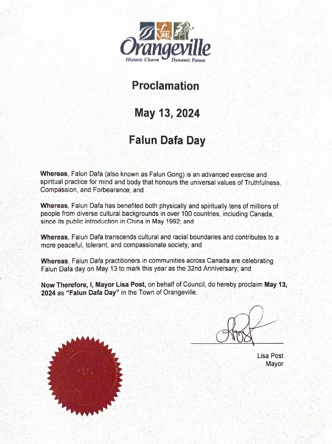 法轮大法超越文化和种族的界限,为建立一个更加和平、宽容和富有同情心的社会作出了贡献,鉴于加拿大各地的法轮大法修炼者于五月十三日庆祝法轮大法日,并且今年为第三十二周年,因此现在,由我,丽莎·波斯特代表市议会,特此宣布二零二四年五月十三日为奥兰治维尔镇法轮大法日。