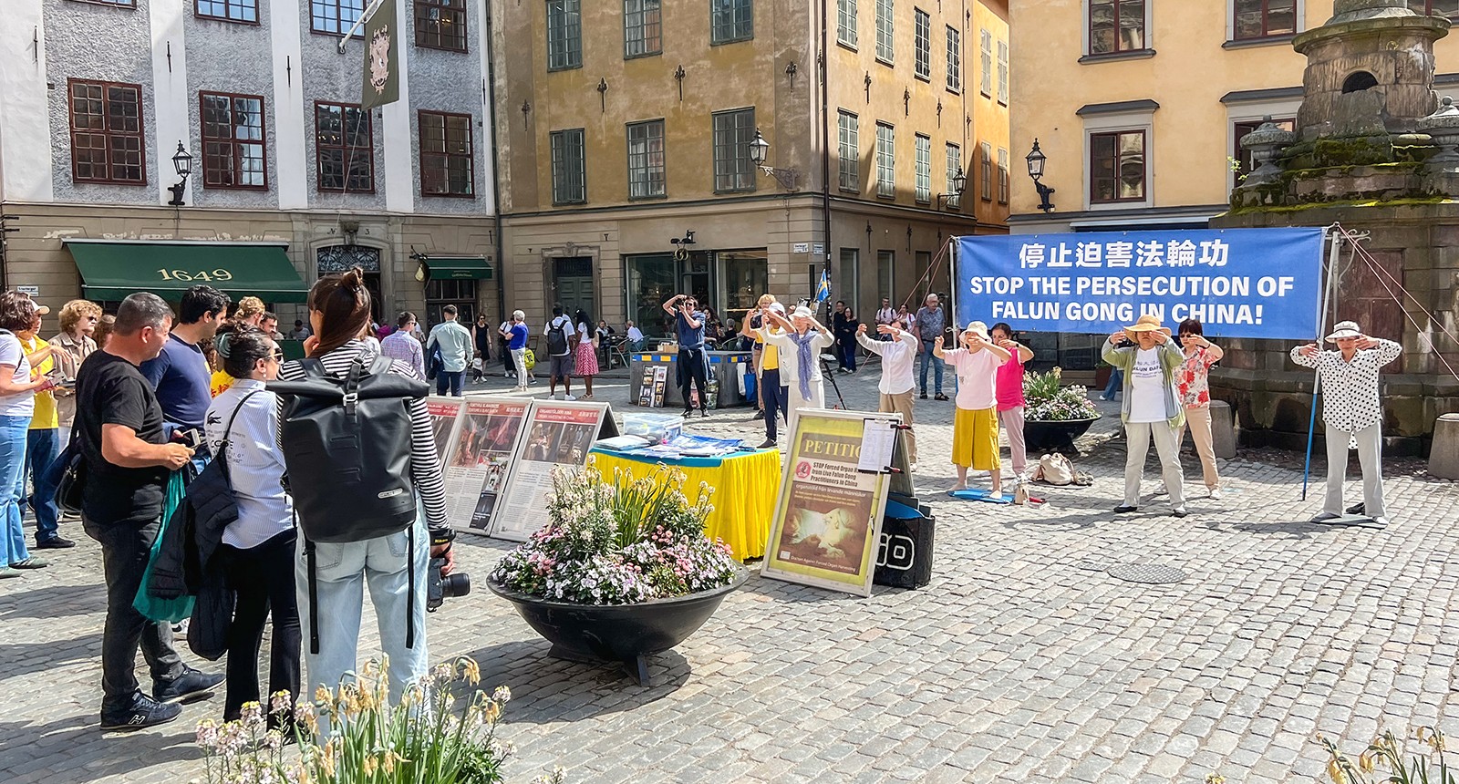 ![]() 图1:二零二四年五月份每周五和周六,法轮功学员在斯德哥尔摩诺贝尔博物馆前设立真相展位。学员向市民演示五套功法,吸引了许多人驻足观看了解真相。 |