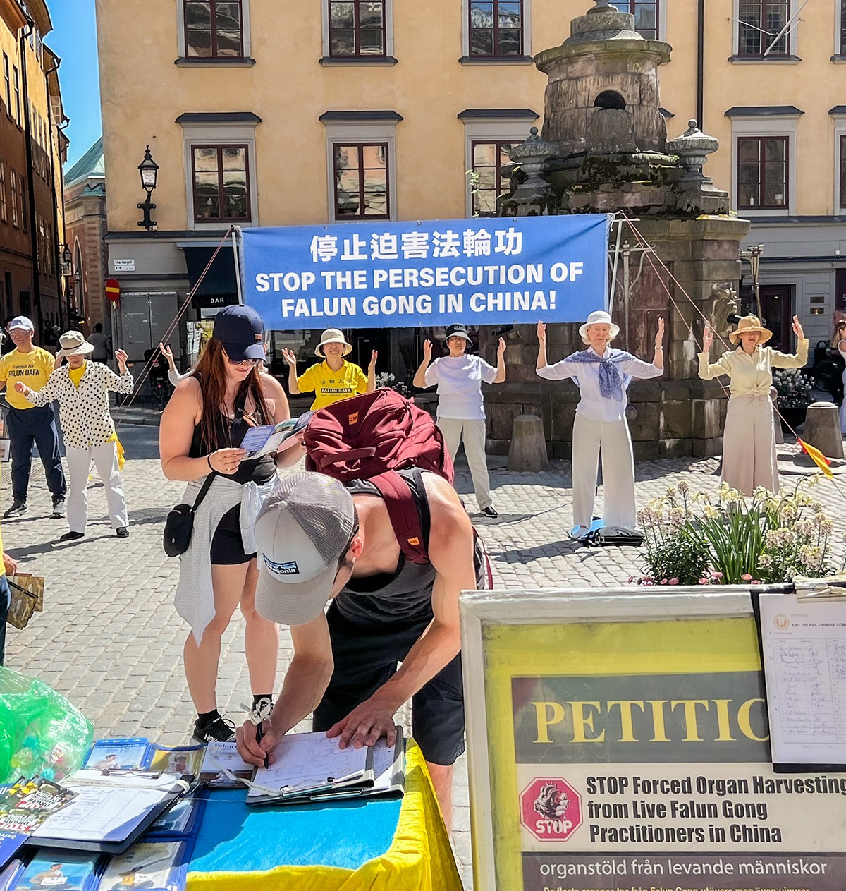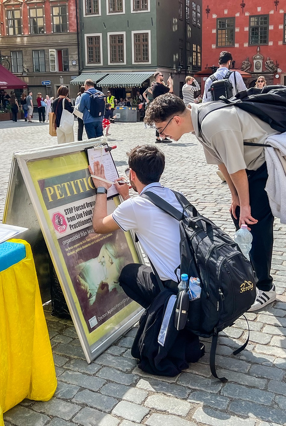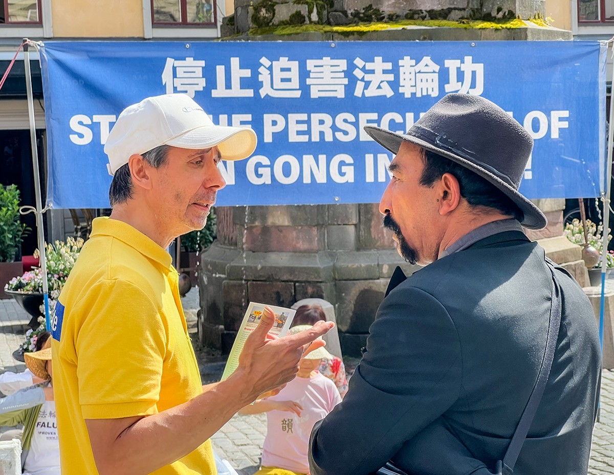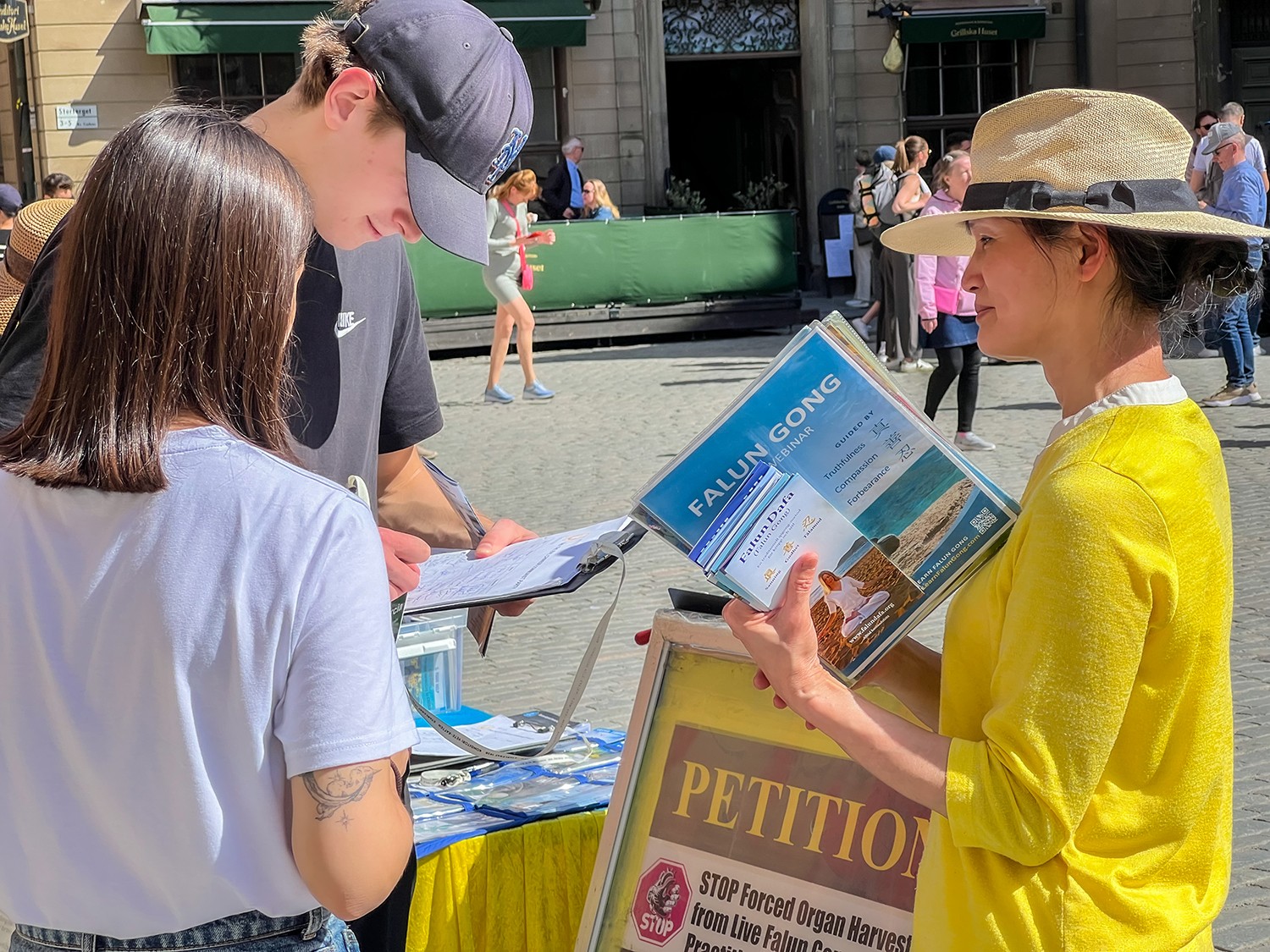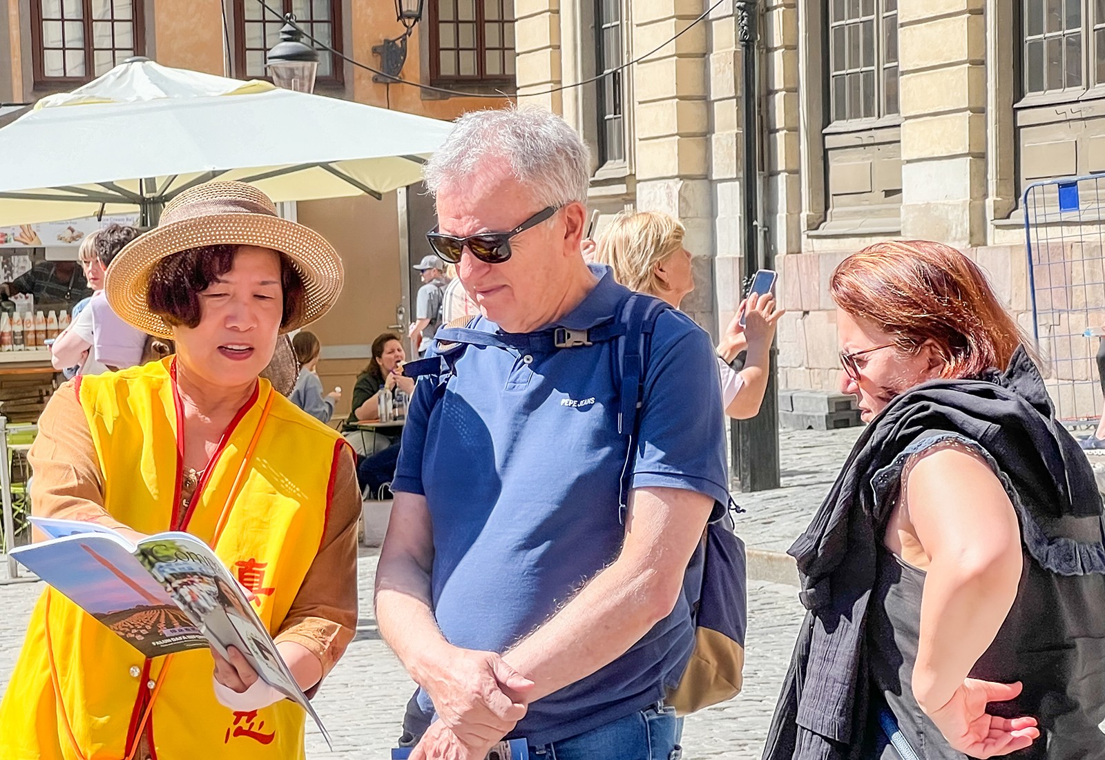 一位来自大陆的年轻人,当他从诺贝尔博物馆大门走出来时,看到很多人都停留在真相展位前了解真相、签名支持法轮功,他先是震惊,随后脸上流露出一副佩服的表情。学员向他讲真相后,他笑着说:“我相信你们告诉我的这些讯息都是真的,因为我们家也受到中共的迫害。我的奶奶常跟我讲,共产党迫害人都是一步一步逼你到最后再把你整死,一定要远离它。我本人根本就不相信共产党。我很佩服你们敢在这里公开向人们讲真相,把中共这些见不得人的事给它曝光。”