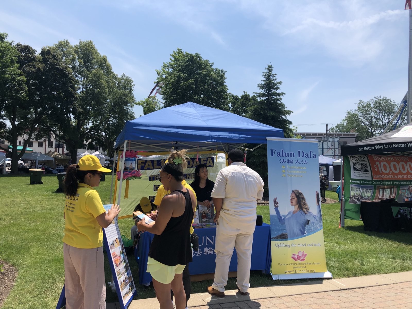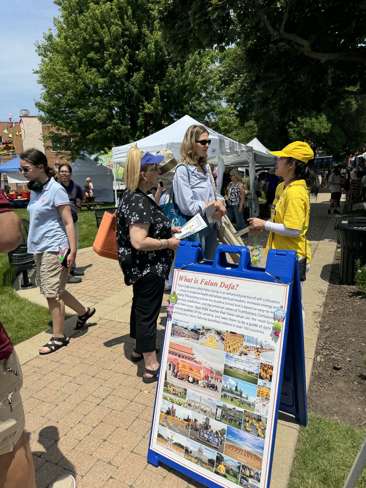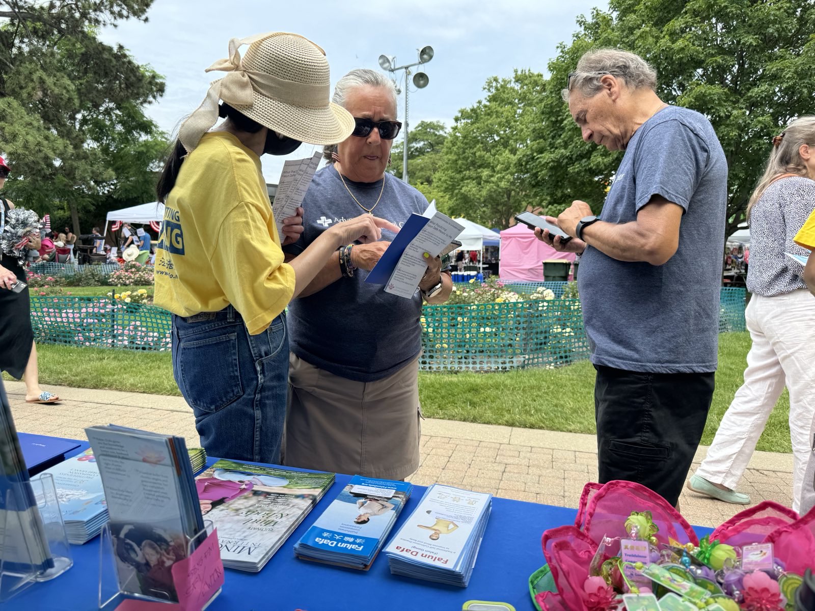 【明慧网二零二四年六月二十二日】二零二四年六月十三日到十六日,美国芝加哥法轮功学员再次参加了芝加哥北郊的小城利伯蒂维尔(Libertyville)举办的一年一度的城市节庆(Libertyville Days Festival)。很多当地民众了解了法轮大法,并在现场学炼法轮功。相当多的人很高兴知道法轮功学员在附近的公园有一个炼功点,表示他们会在周日去炼功点学习功法。