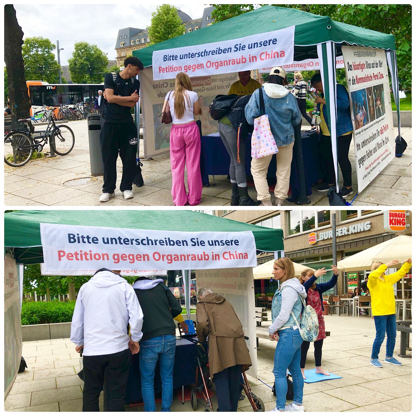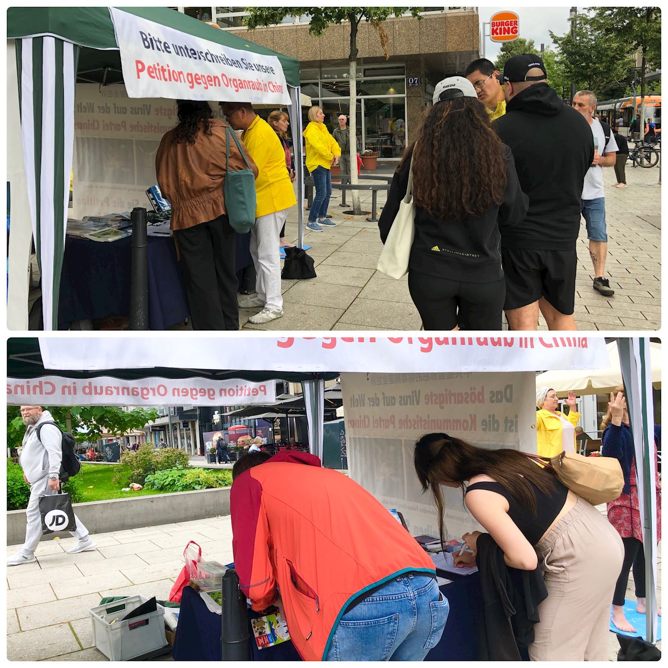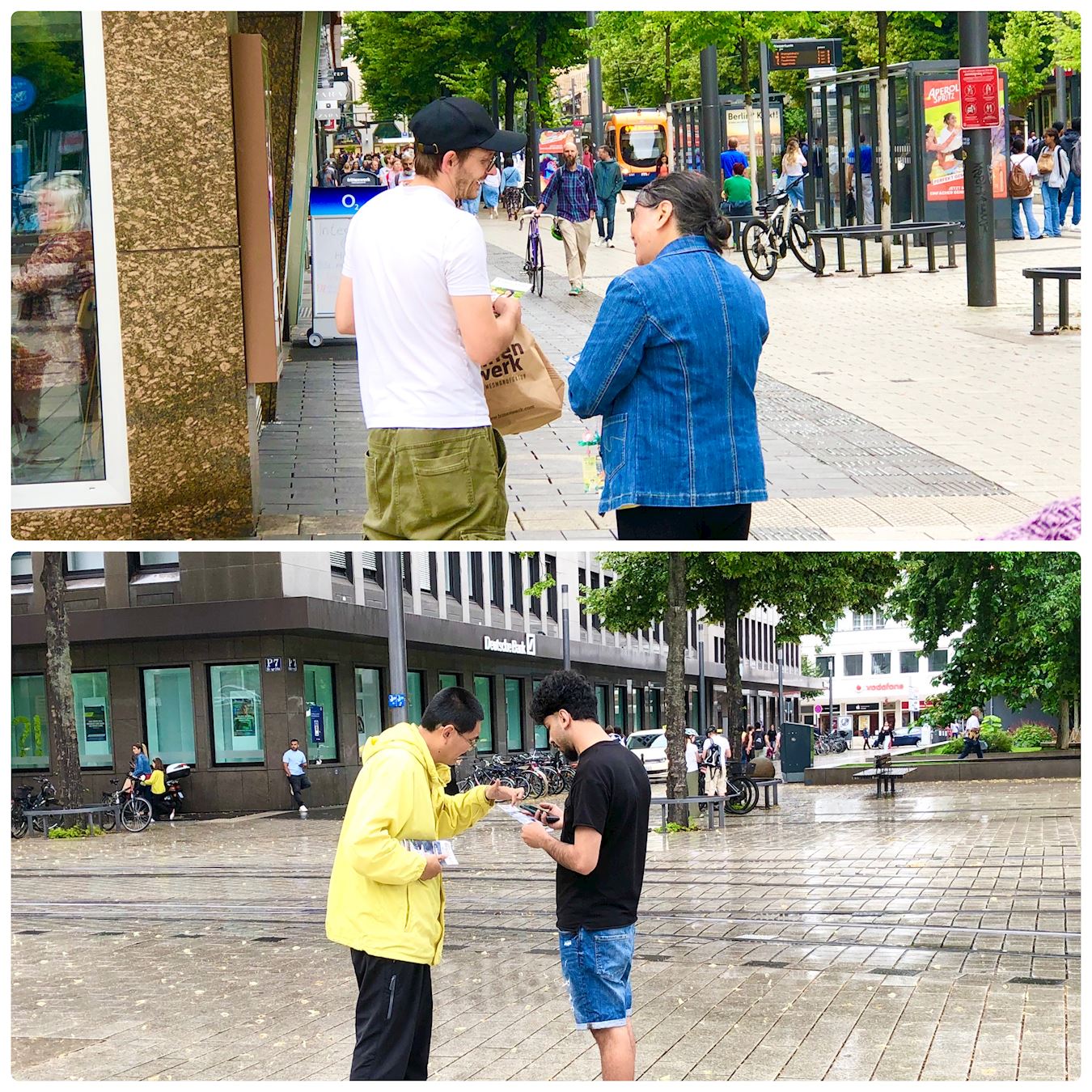 两位家住曼海姆的高中生仔细阅读学员递过来的传单后在征签表上签名。其中的一位男生说,“今天得知了这个信息(中共迫害法轮功)对我来说很重要,以前我也听说过对新疆维吾尔族人的迫害。我觉得,在这里,在西方世界,表明立场非常重要。”