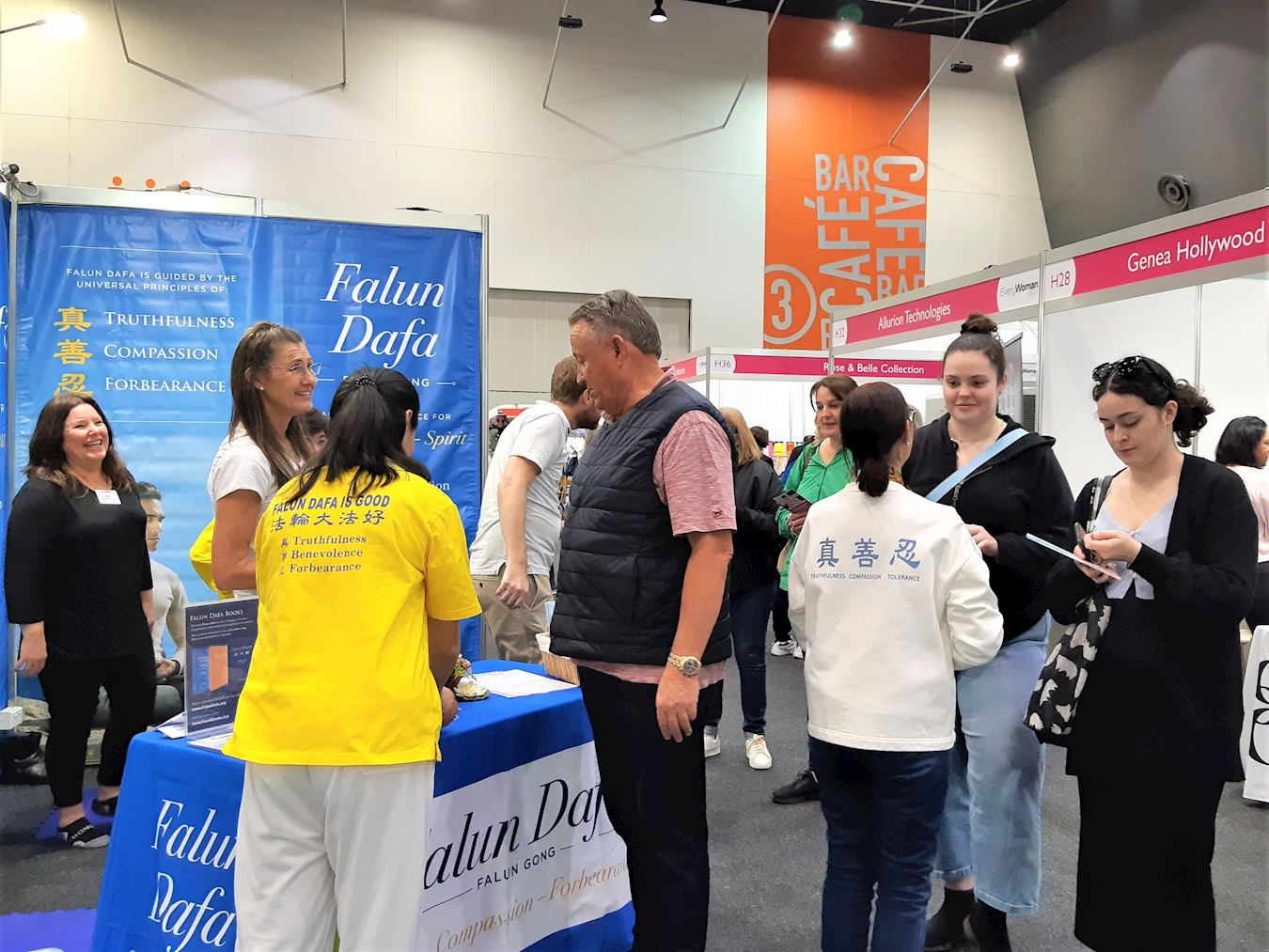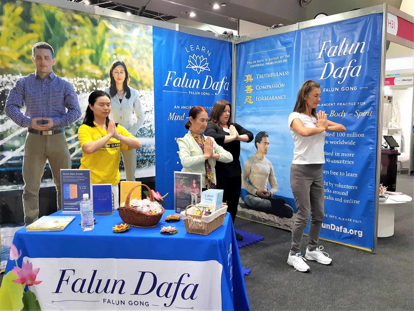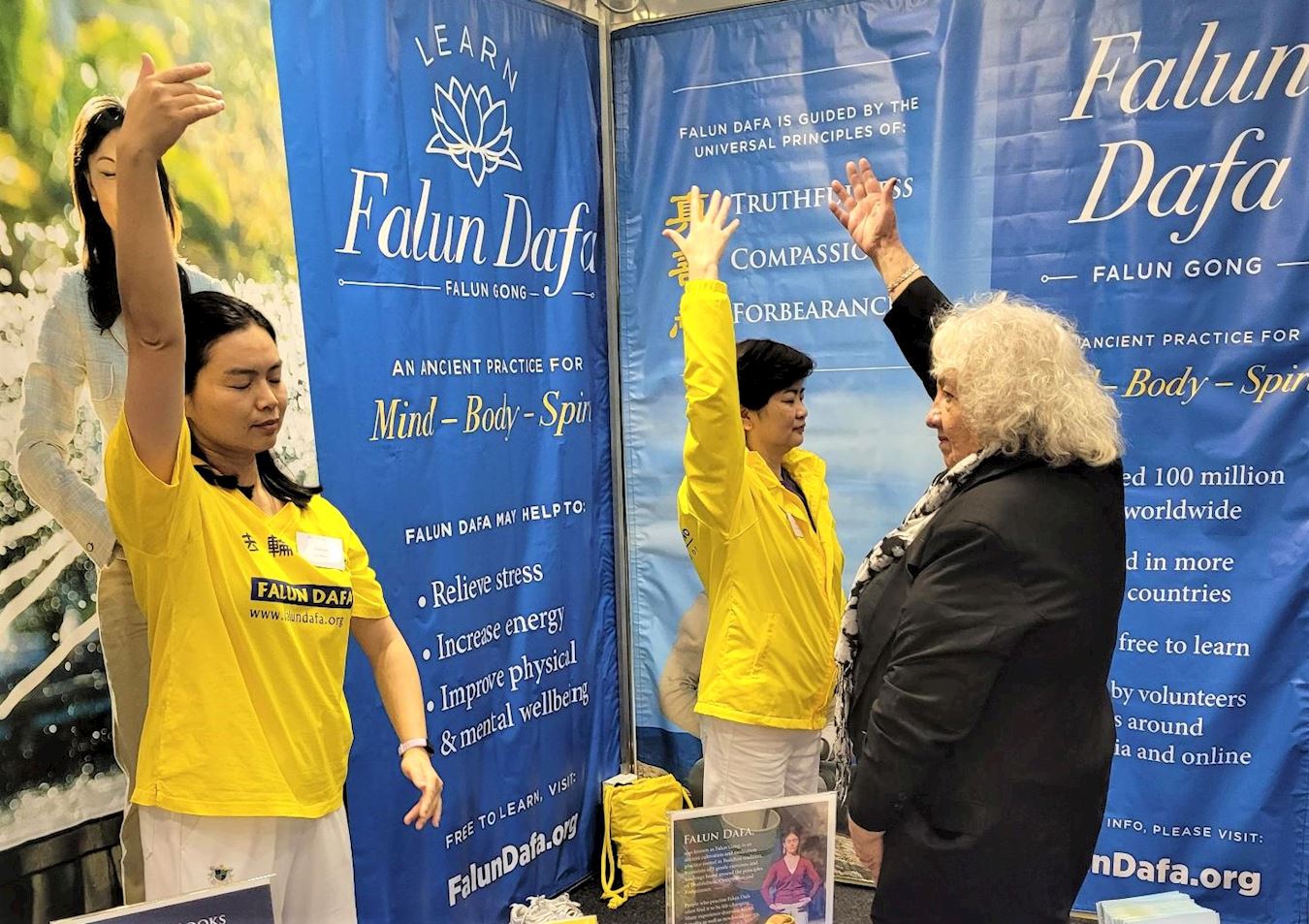 法轮大法展位让人耳目一新。在悠扬的炼功音乐中,学员们优美祥和的功法演示,吸引很多人驻足观看。许多参观者表示对学炼法轮功很感兴趣,并询问相关信息。