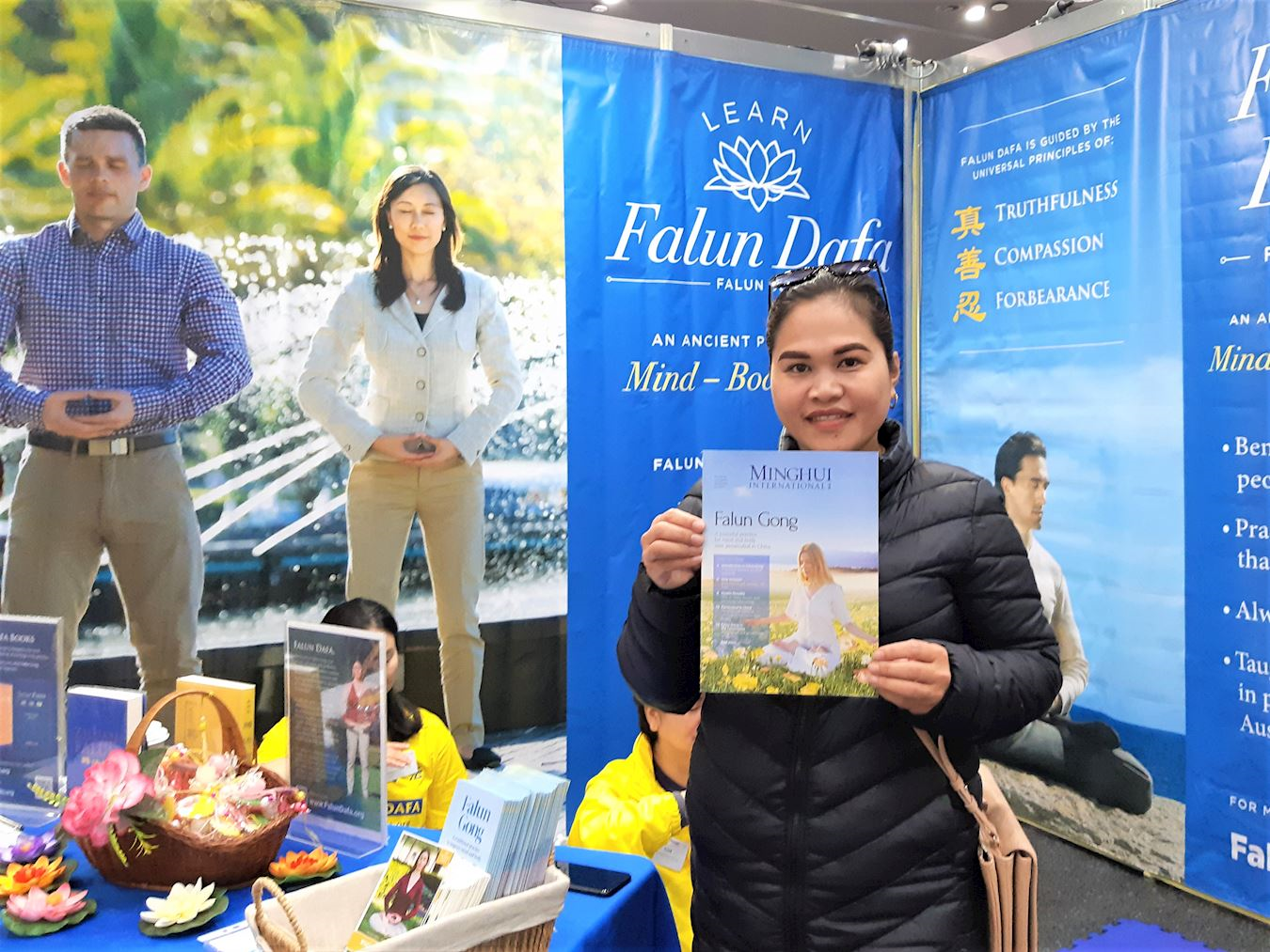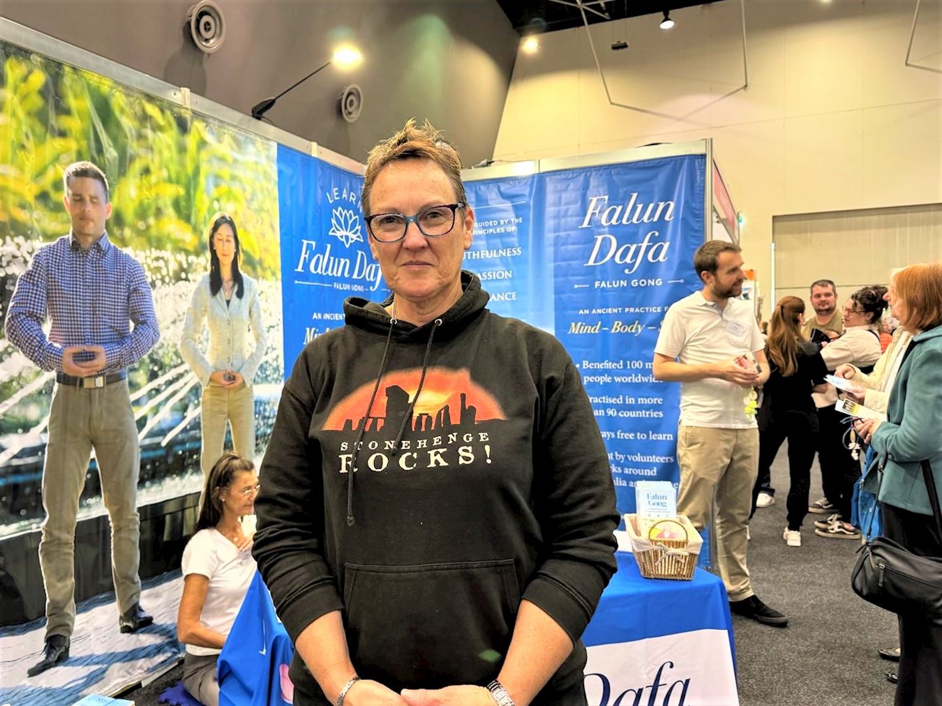 帕特里夏·布什比(Patricia Bushby)表示很喜欢法轮大法展位,“这里非常好,坐在那里盘腿打坐的女士太棒了!我喜欢法轮大法修炼的精神层面。”