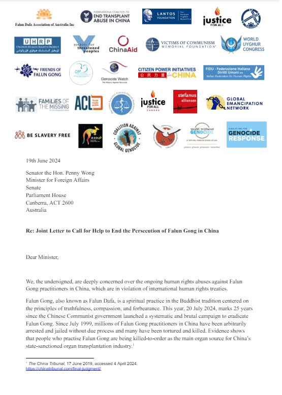 ![]() 图1:二零二四年的“七·二零”前夕,二十六个民间组织(NGO)联署并致信澳洲总理和外长,紧急呼吁澳洲政府帮助制止中共迫害法轮功。图为联署信首页。 |