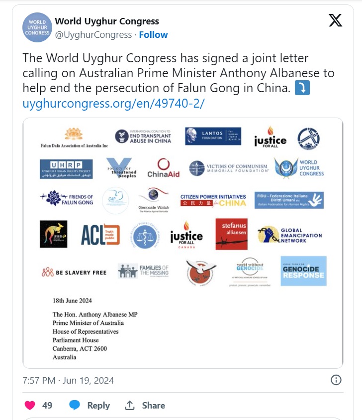 世界维吾尔大会于六月十九日将该联署信在其官网发布,并表示,“中共对法轮功修炼者持续的人权虐待,我们对此深感忧虑,这违反了国际人权条约”,“我们敦促澳洲政府立即采取行动,解决这些严重的人权侵犯问题。”
