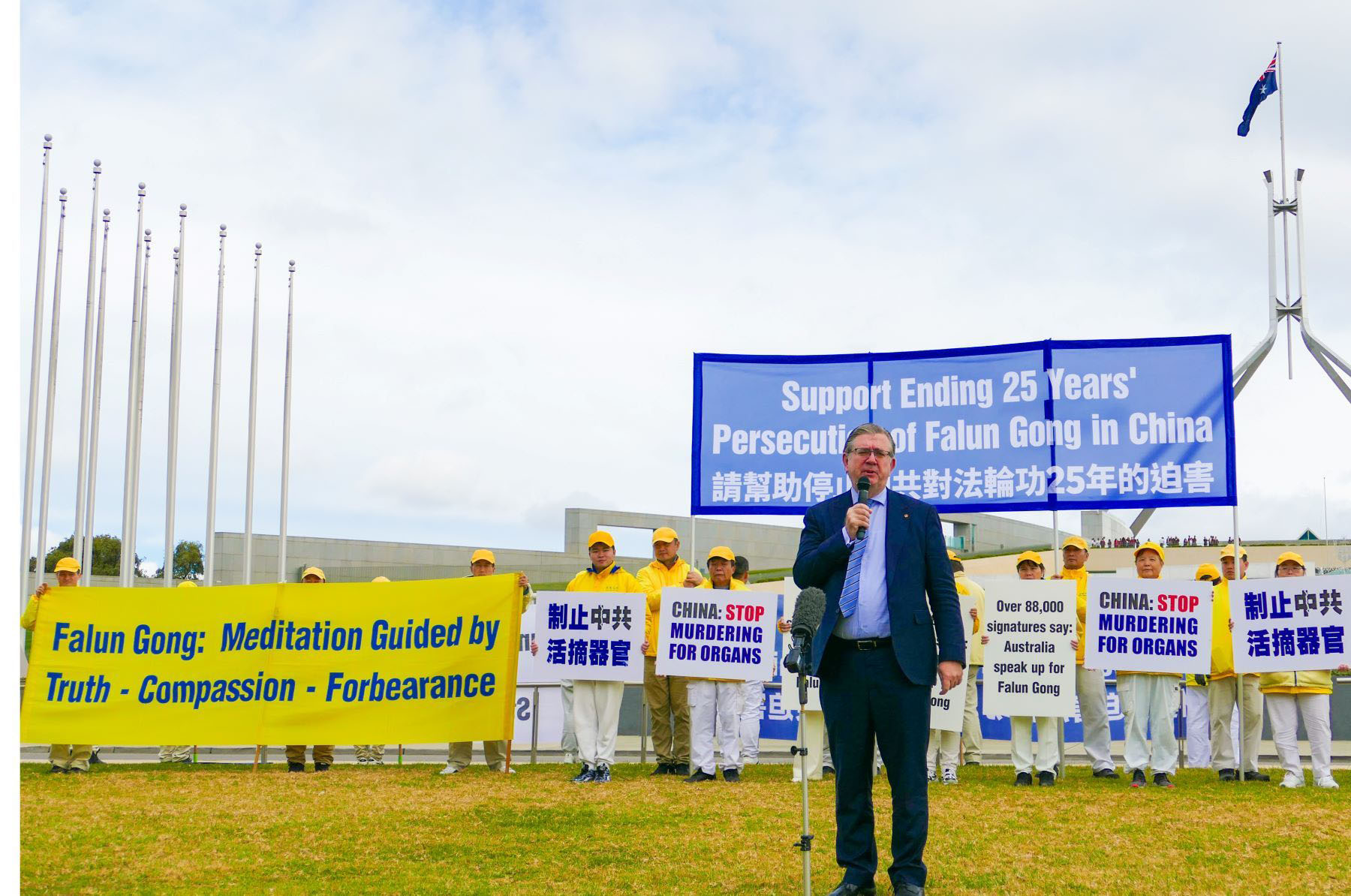 参议员马尔科姆・罗伯茨(Malcolm Roberts)在集会上发言时表示,同情法轮功学员遭受的迫害,“我首先对你们所承受的一切表示同情。我知道你们在中国的亲人正遭受拘禁和折磨,我也知道你们中有人曾经受到迫害酷刑。”