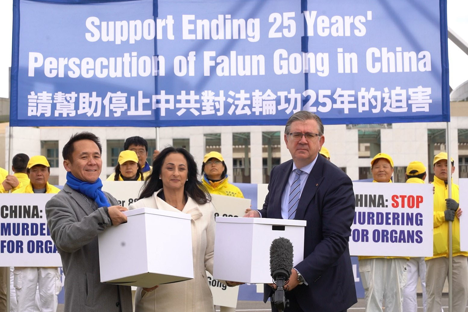 法轮功学员近期向各界澳洲民众征集请愿书的签名,请愿书呼吁政府帮助结束中共对法轮功团体迫害的。当日在集会上,法轮功学员向两位联邦参议员提交了约二万四千个签名的请愿书。