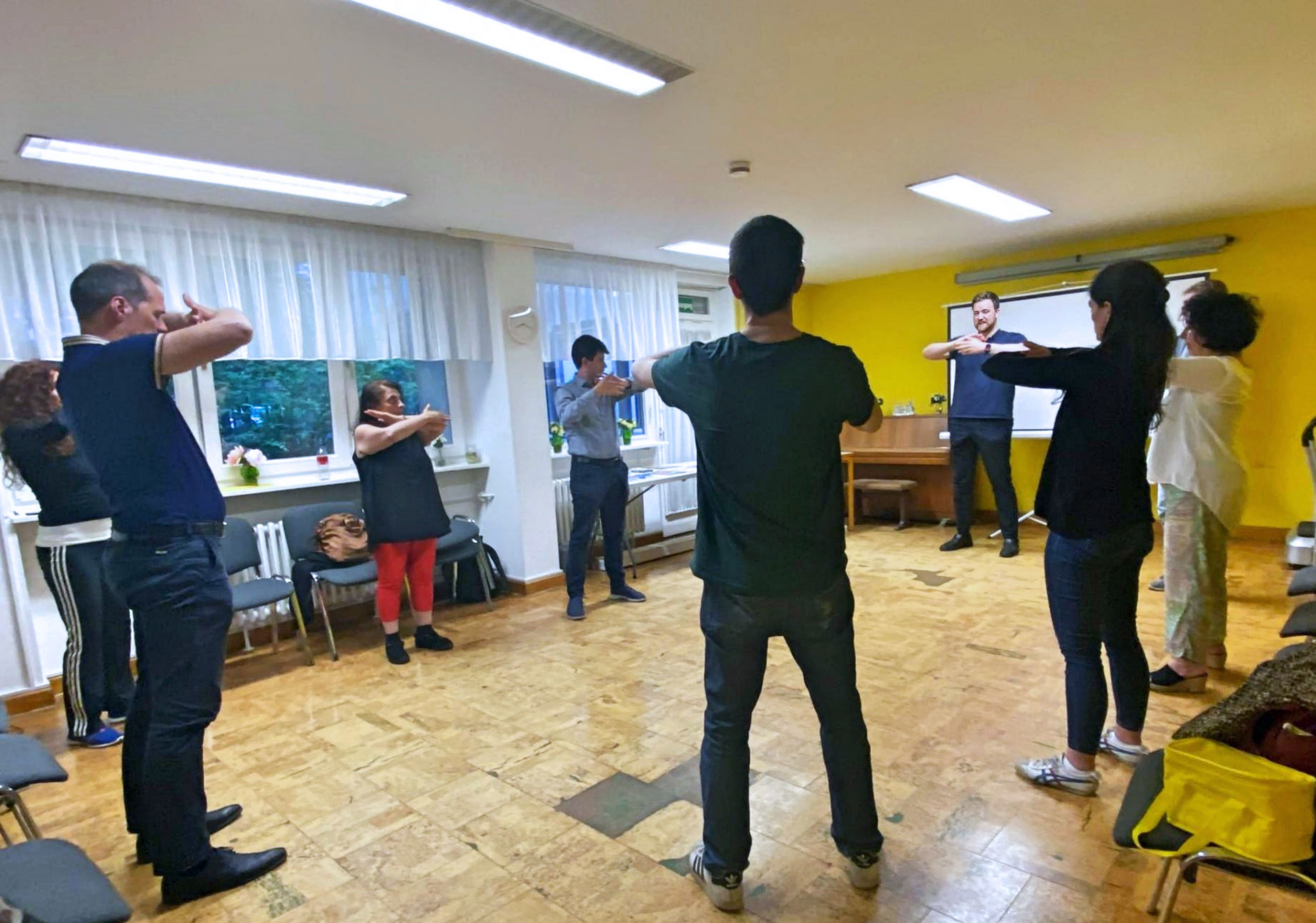 ![]() 图1:柏林九天班上,人们学炼法轮功五套功法。 |