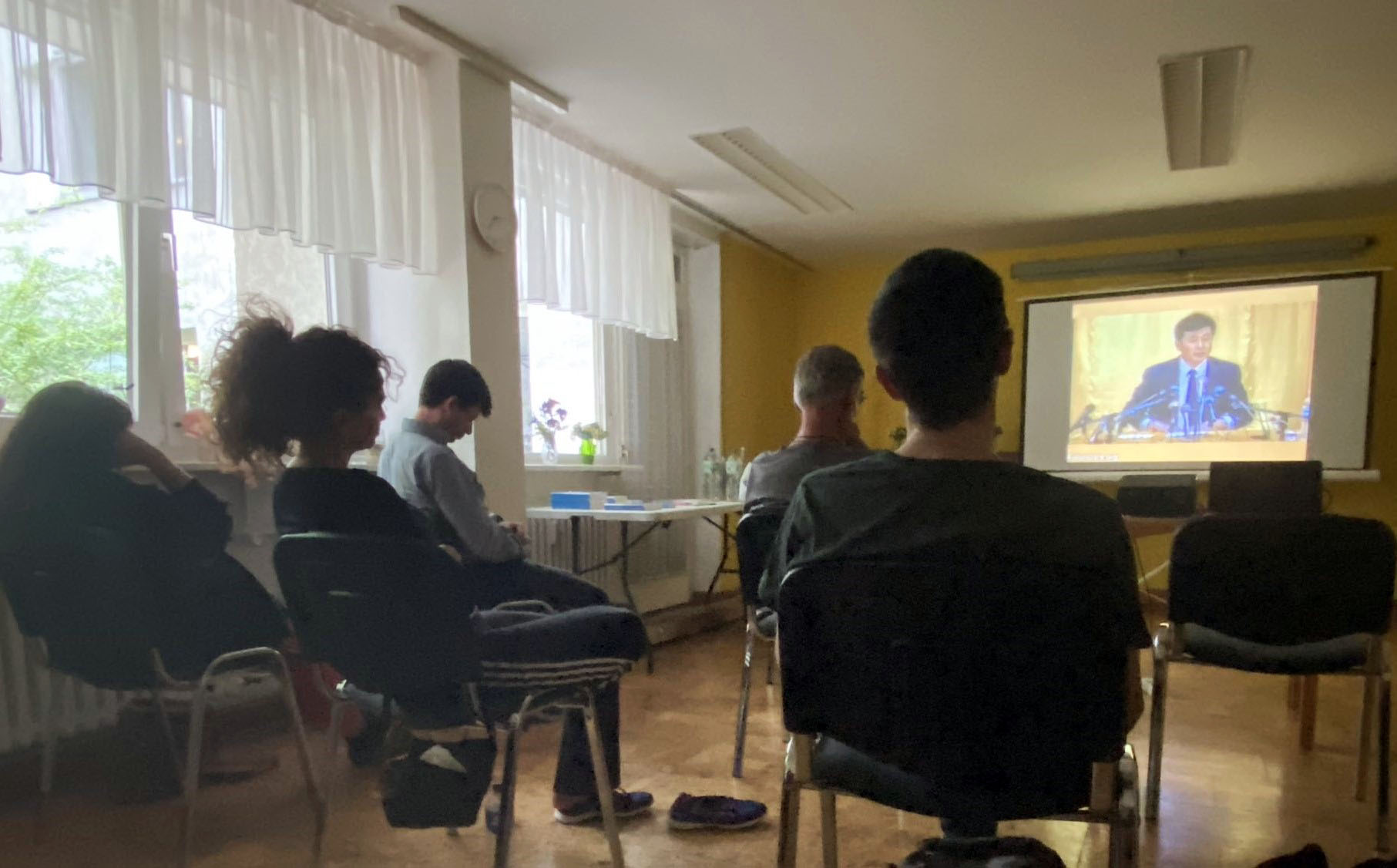 ![]() 图2:柏林九天班上,人们观看李洪志大师的讲法录像,学习法轮大法的法理。 |
