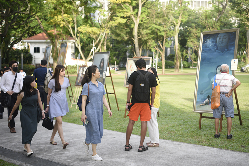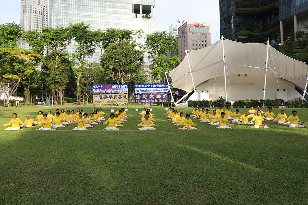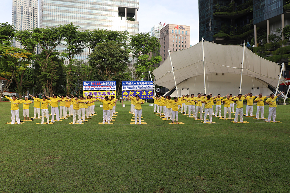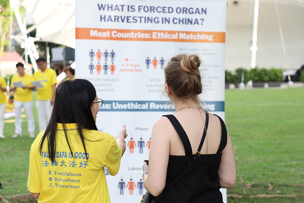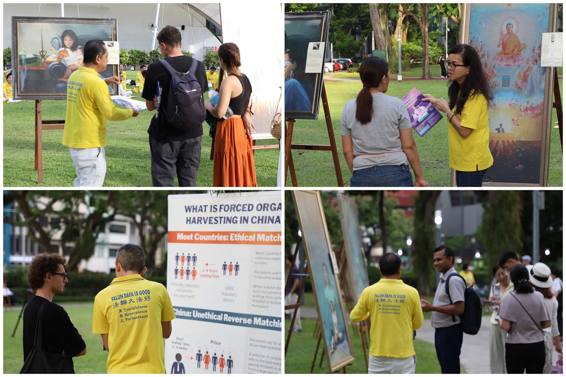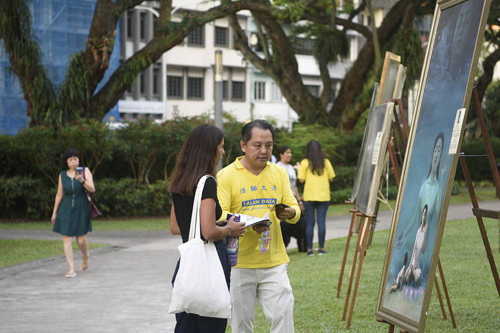 一群泰国少年停下来,接过学员们递上的真相资料和小莲花。一位澳洲十三岁女孩跟随家人来新加坡旅游,她为附近休息的家人拿了资料。两位中国的中年人带着两个小孩子遇到学员递上资料,起初其中一位中年人拒绝接受,身边十岁左右的男孩却态度坚决地拿过资料说:“看一下嘛!”结果一行四个人都翻起了真相资料。
