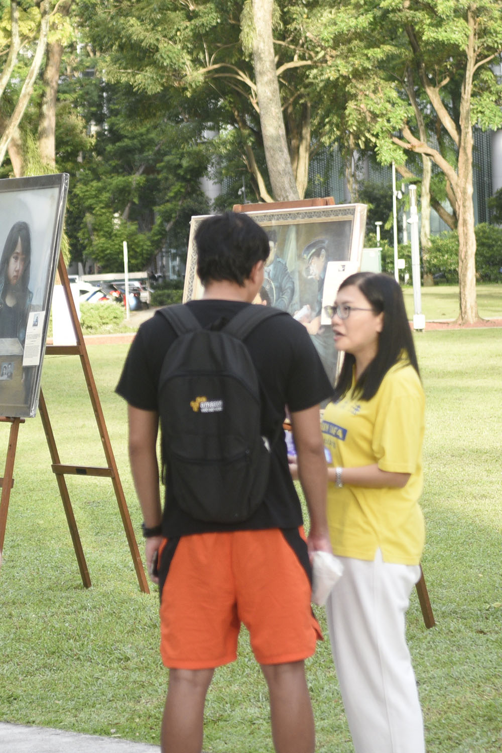一位来自中国的青年仔细观看了《打毒针》这幅画作,并拍照留念。他表示知道法轮功是被迫害的,他有亲戚被抓过,在香港也曾看到过法轮功学员讲真相。学员问他是否声明退出了邪党组织,他说自己心里上早就不支持它了。学员告诉他还是要公开在大纪元网站上声明一下,用化名即可,于是他欣然同意退出中共团、队组织。