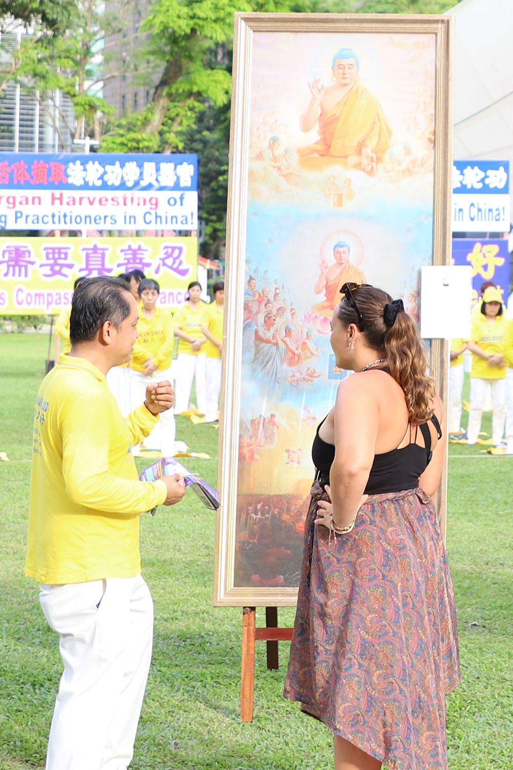 纷至沓来的各族裔民众有在附近工作的上班族,也有来自澳洲、比利时、瑞士、英国、印度、菲律宾和中国等地的游客。人们驻足了解真相,谴责中共迫害,也有人想要学炼功法。多名中国人同意退出中共邪党组织。