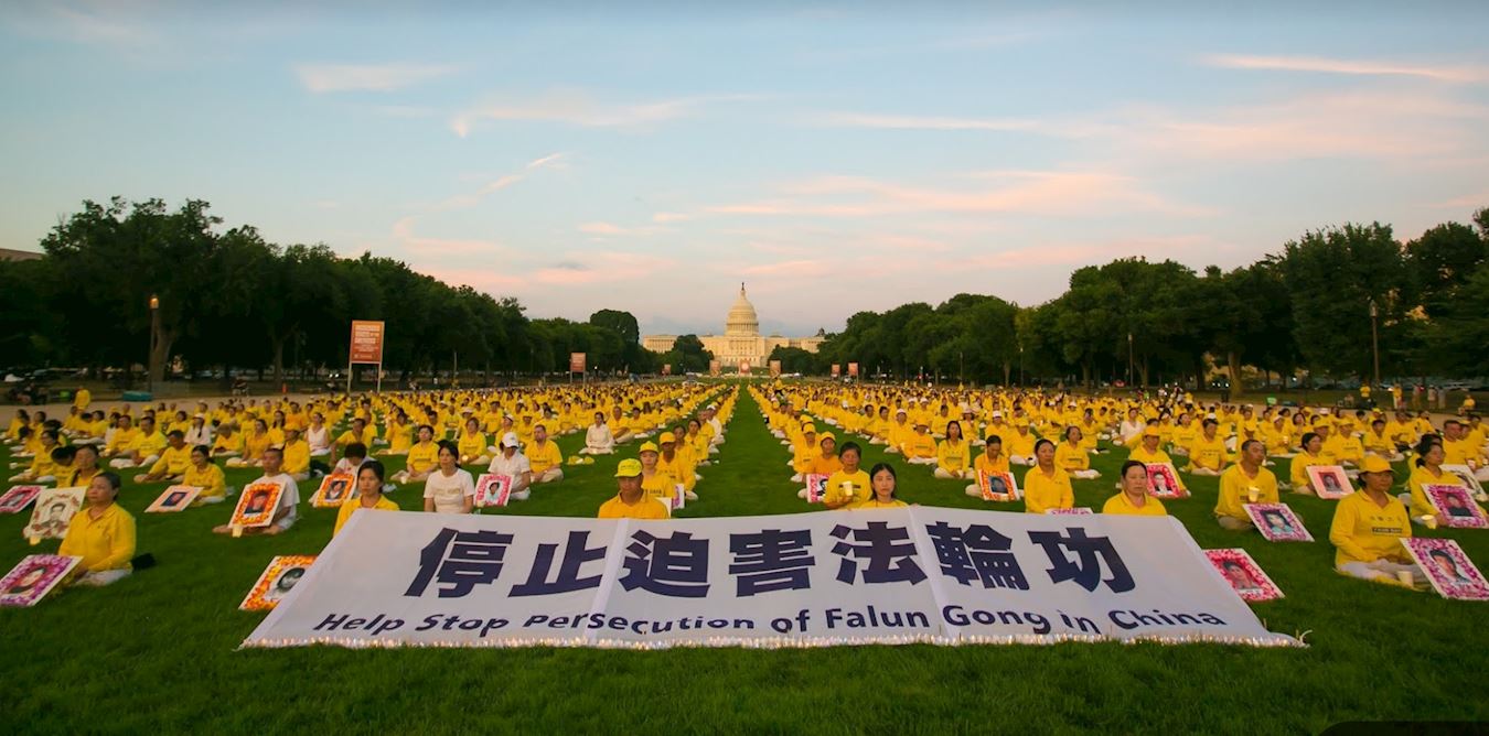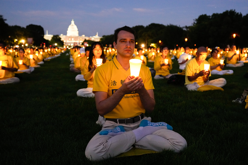伴随夜幕降临,近一千五百名身着黄色上衣的法轮功学员,点燃手中的蜡烛,静静地坐在草坪上,悼念过去二十五年来被中共迫害致死的法轮功学员,呼吁制止中共迫害法轮功。