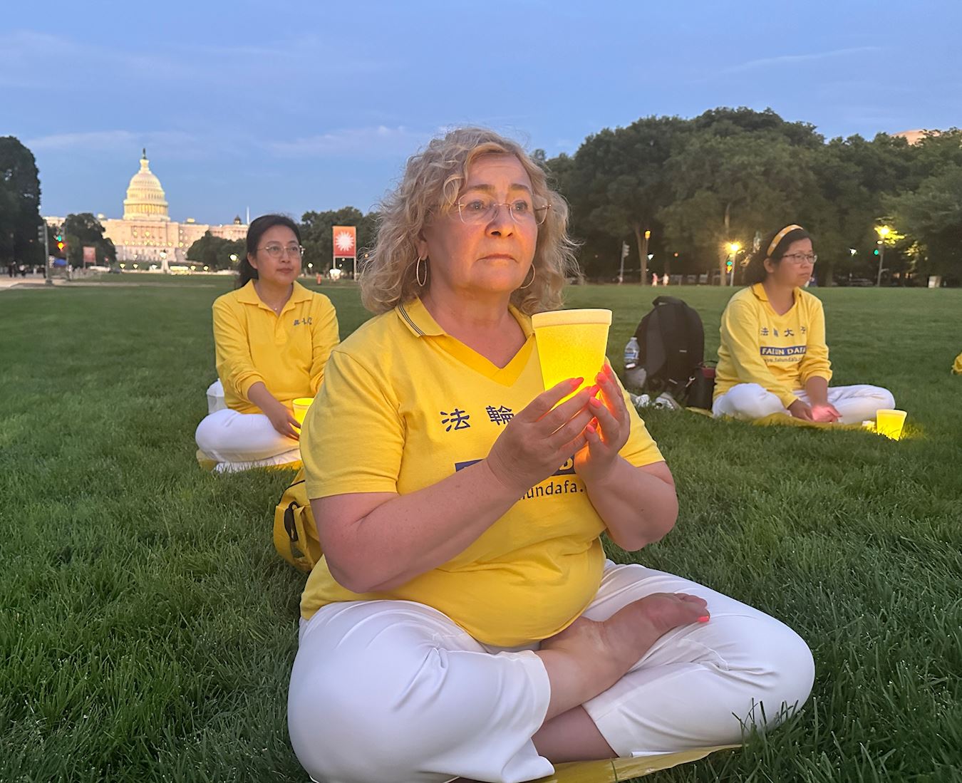 弗里达和其它不同族裔的法轮功学员一起坐在草坪上,举起手中的蜡烛。她说:“此时此刻,我的脑海里在想那些只因要做好人,信仰真、善、忍,就被(中共)迫害致死的人们。这非常让人难过。我们来这里也是为了缅怀那些在中国因不放弃修炼大法而失去生命、失去家庭、失去一切的人们。我们来这里是为了告诉普通民众在中国正在发生的事情。”