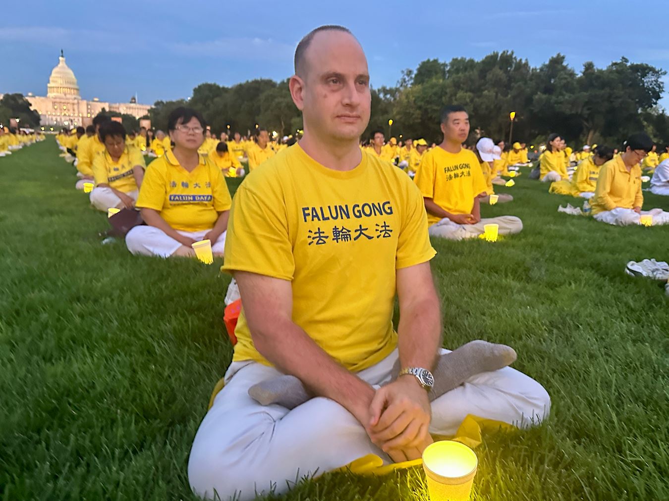 '图5:二零二四年七月十一日晚,来自以色列的法轮功学员塔穆兹·伊泰参加在美国首都华盛顿的国家广场举行的烛光夜悼,呼吁制止中共迫害法轮功。'