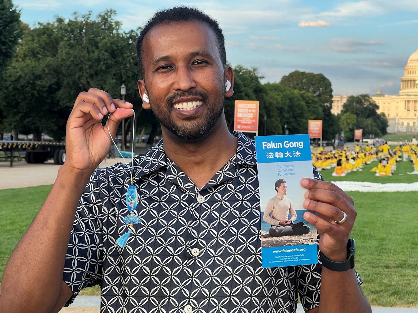 阿布杜拉(Abdul Nomad)是埃及移民,专业分子化工,在华盛顿DC工作,今天陪朋友参观华府,看到晚上上千名法轮功学员在国家广场炼功的场景,舒缓的音乐所吸引,想要了解法轮功,当他得知法轮功修炼者因为炼功做好人而被迫害,甚至被(中共)活摘器官,很震惊,连声说:“我回去马上就去给我的议员打电话,要求他们支持你们结束这场迫害。非常感谢你们到这里来表达你们的心声。”