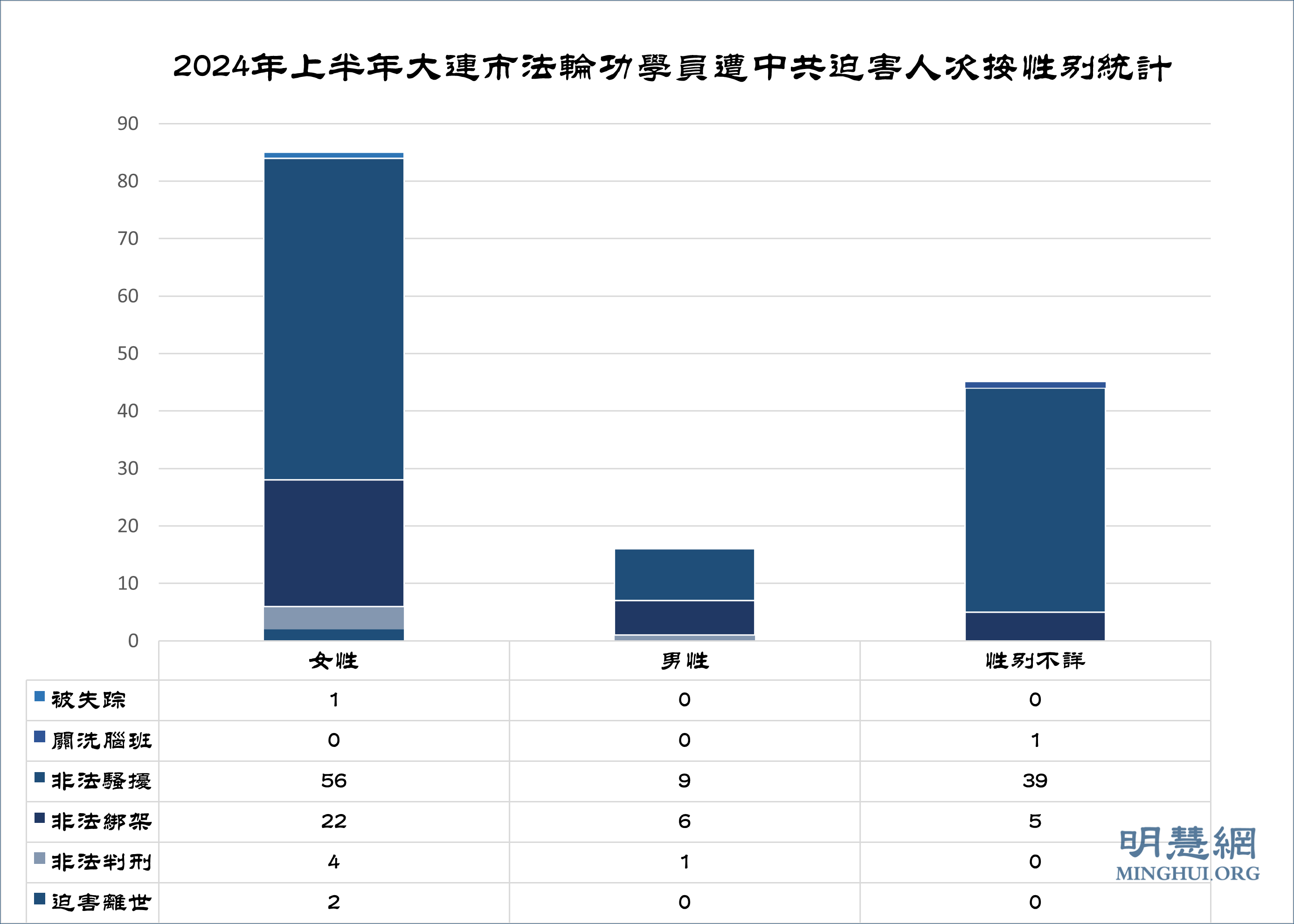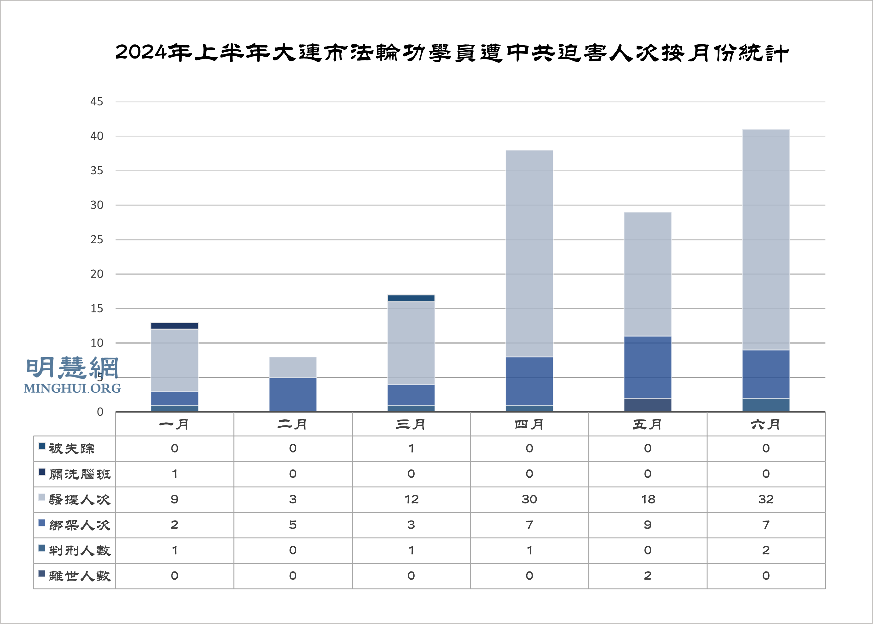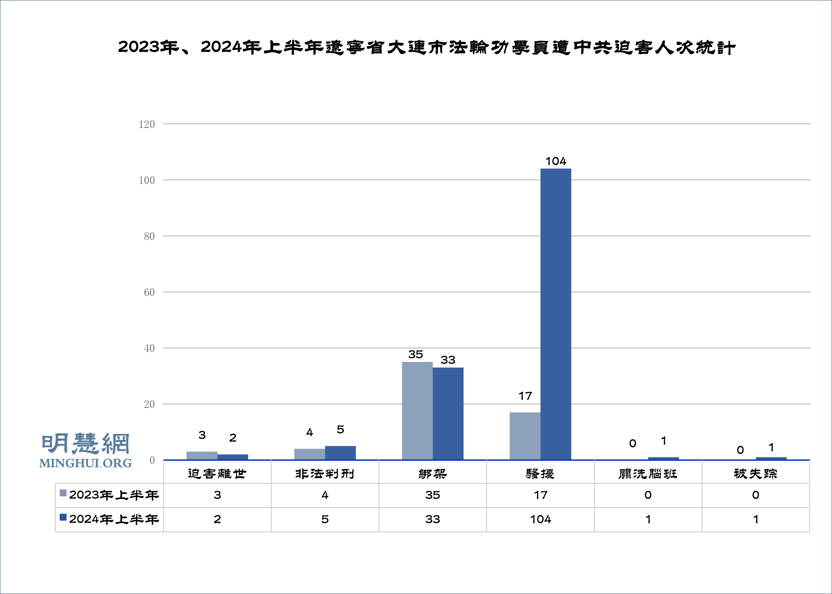 根据明慧网报道统计,二零二四年上半年,大连市法轮功学员遭迫害人次(146人次)是二零二三年上半年(59人次)的2.5倍,主要是被骚扰的人次增多。