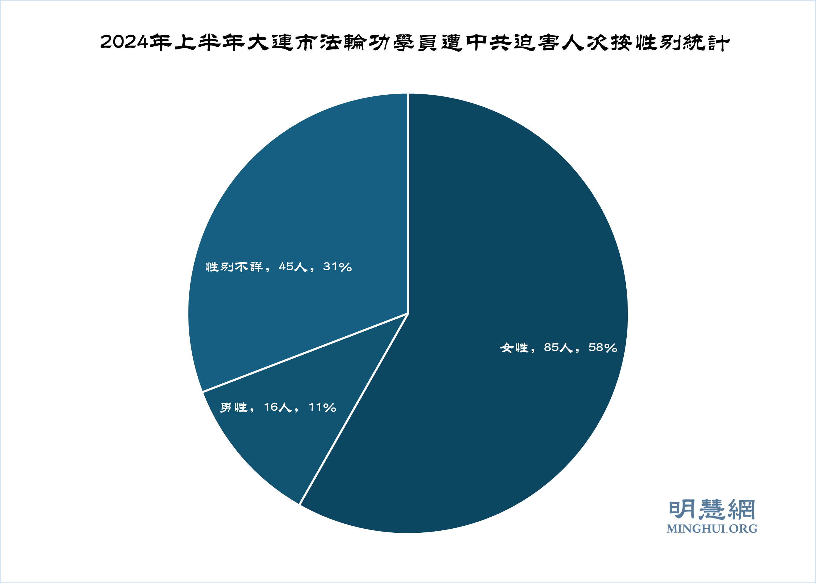 ![]() 图2:2024年上半年大连市法轮功学员遭中共迫害人次按性别统计 |