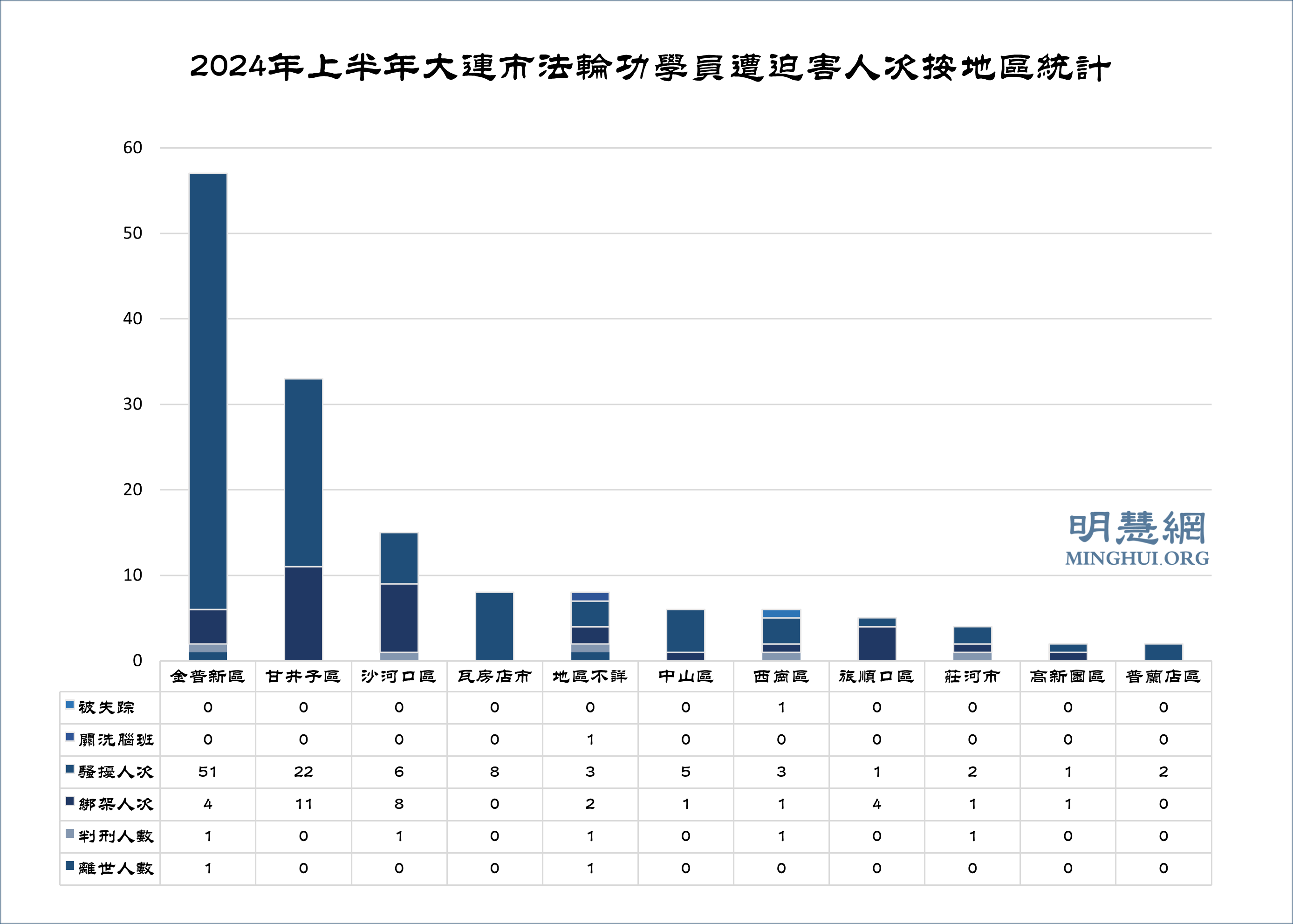 据明慧网报道统计,二零二四年上半年获知,大连市法轮功学员至少有104人次遭非法骚扰,其中5人次被非法抄家,1人被非法限制出行,2人被迫流离失所;其中二零二四年94人次,二零二三年2人次,二零二二年1人次,二零二一年1人次,二零一八年1人次,时间不详5人次;已知60岁以上的19人次,年龄最大的80多岁,其中60~70岁的10人次,70~80岁的7人次, 80~90岁的2人次;骚扰最严重的地区依次为金普新区51人次(其中骚扰最多的是三十里堡街道派出所及社区22人次),甘井子区22人次(其中骚扰最多的是大连湾派出所7人次),瓦房店市8人次,沙河口区6人次,中山区5人次;骚扰最多的月份依次为六月份32人次,四月份30人次,五月份18人次,三月份12人次、一月份9人次、二月份3人次,详见附录。