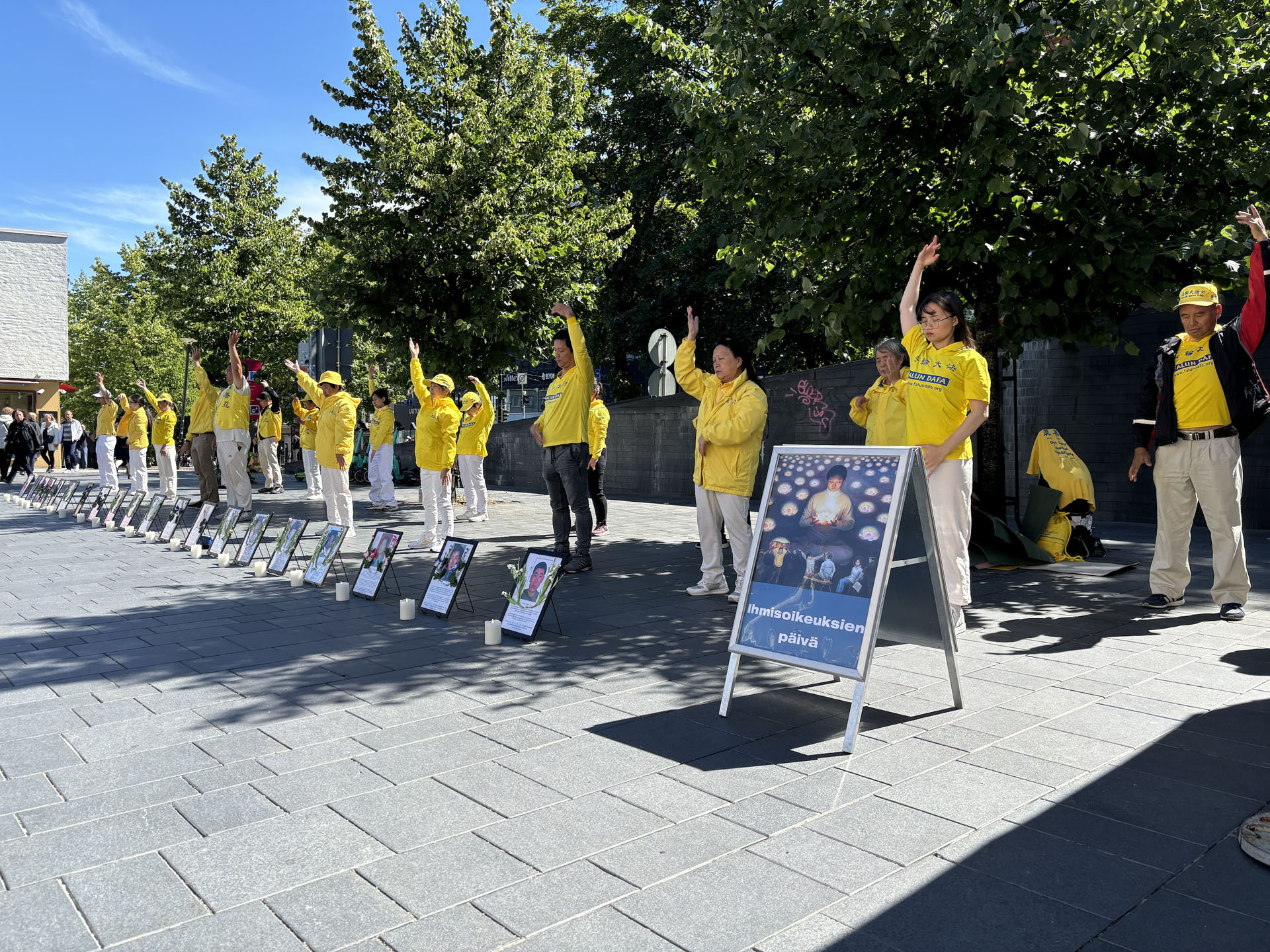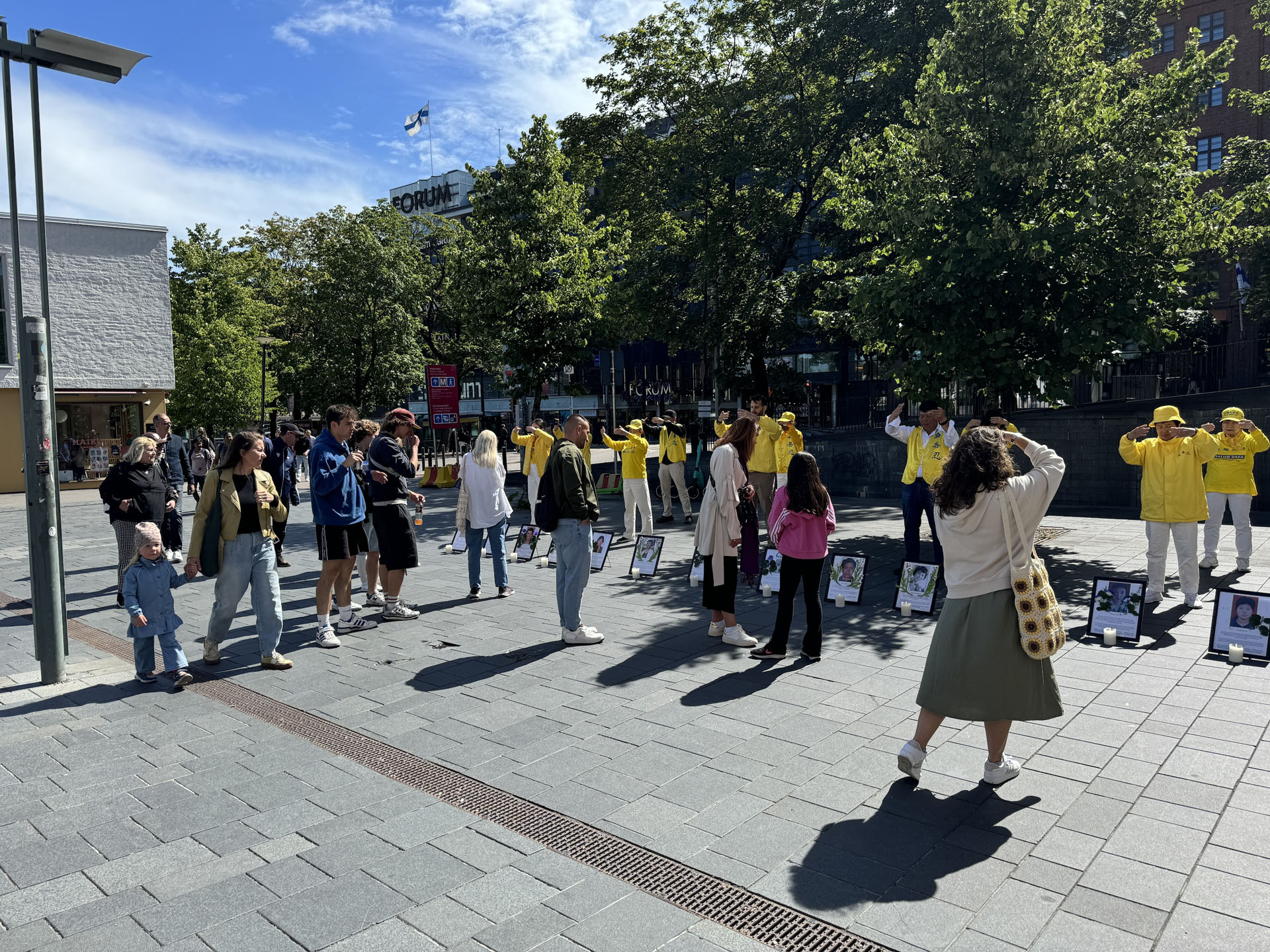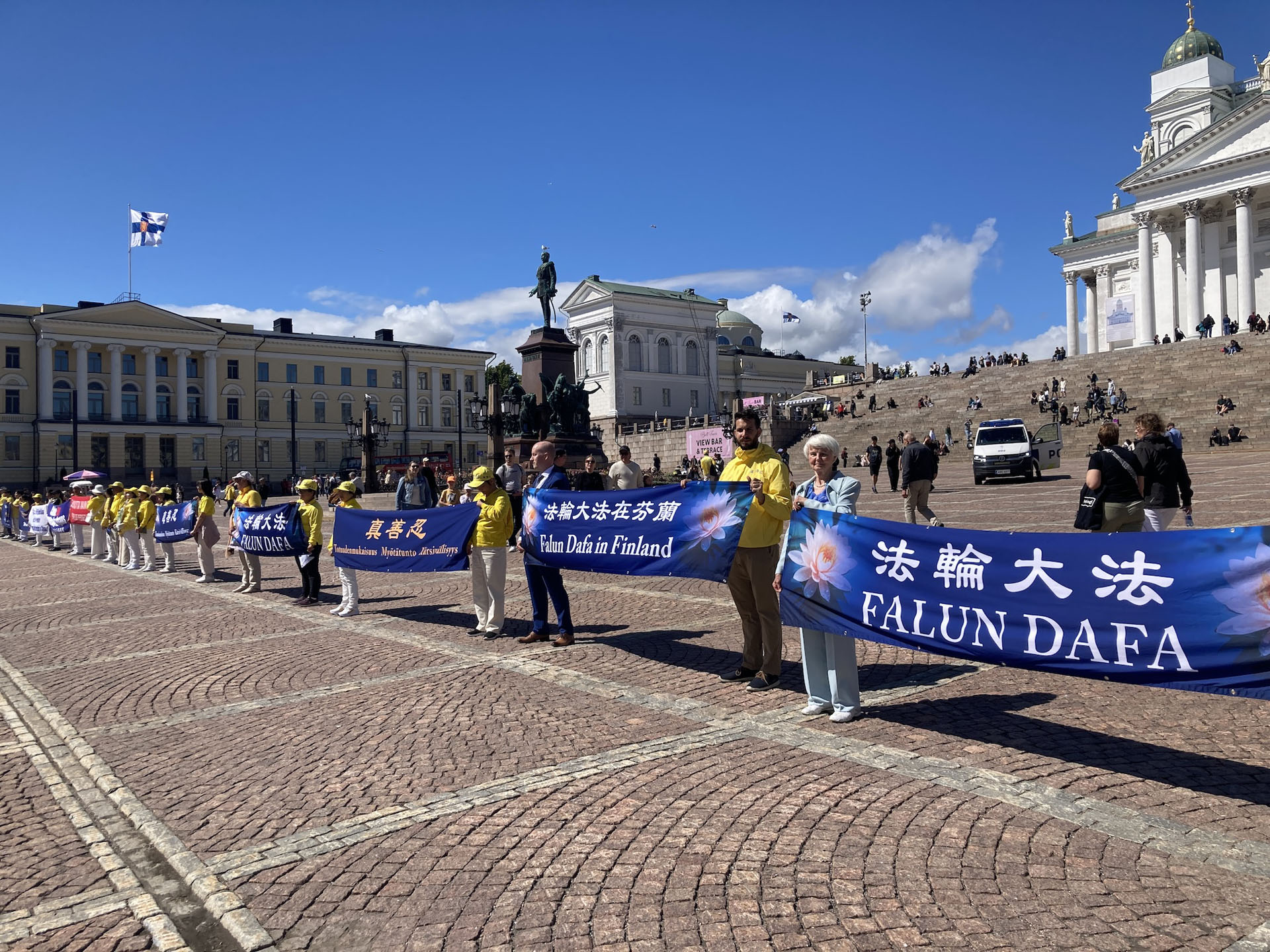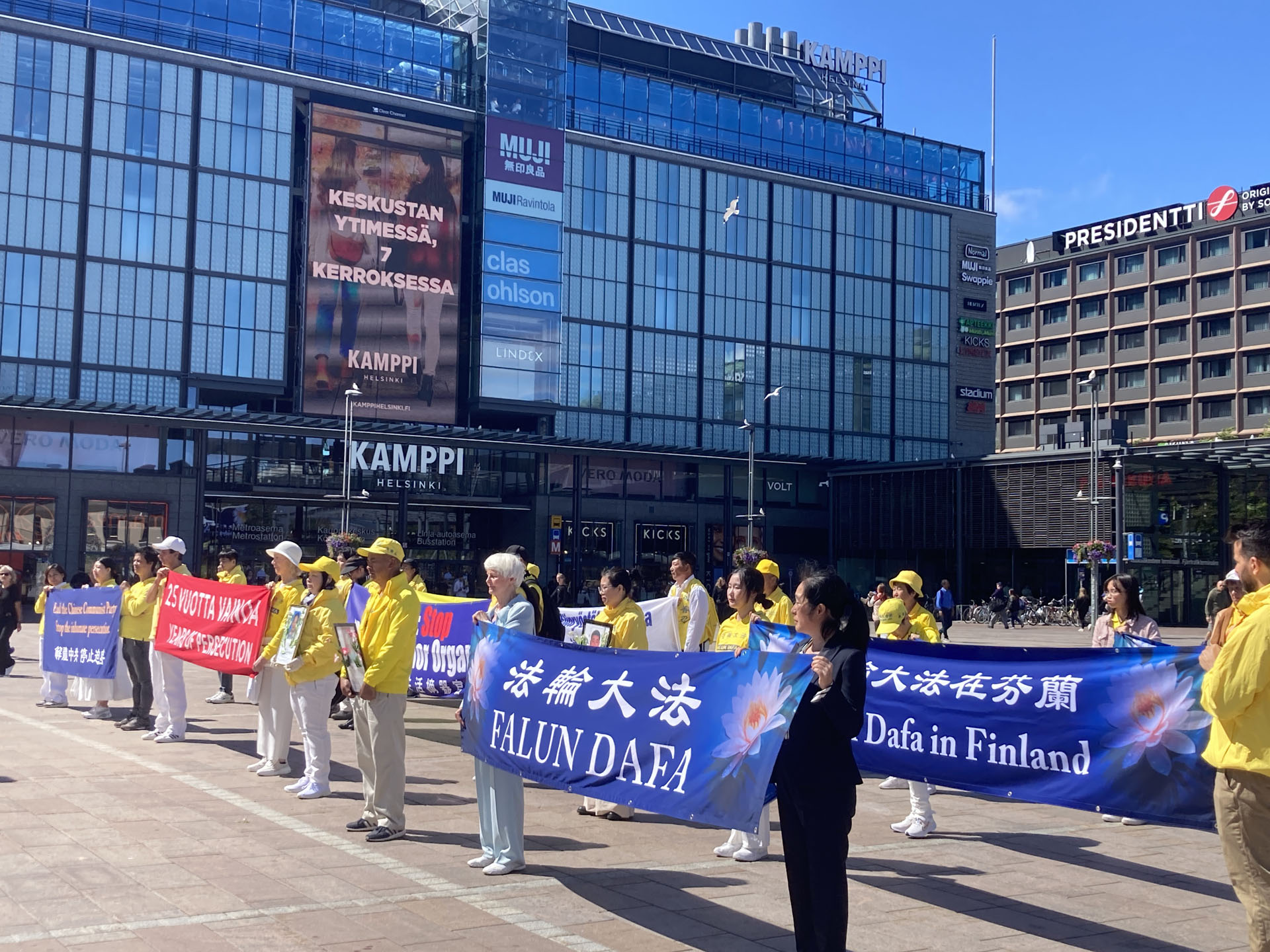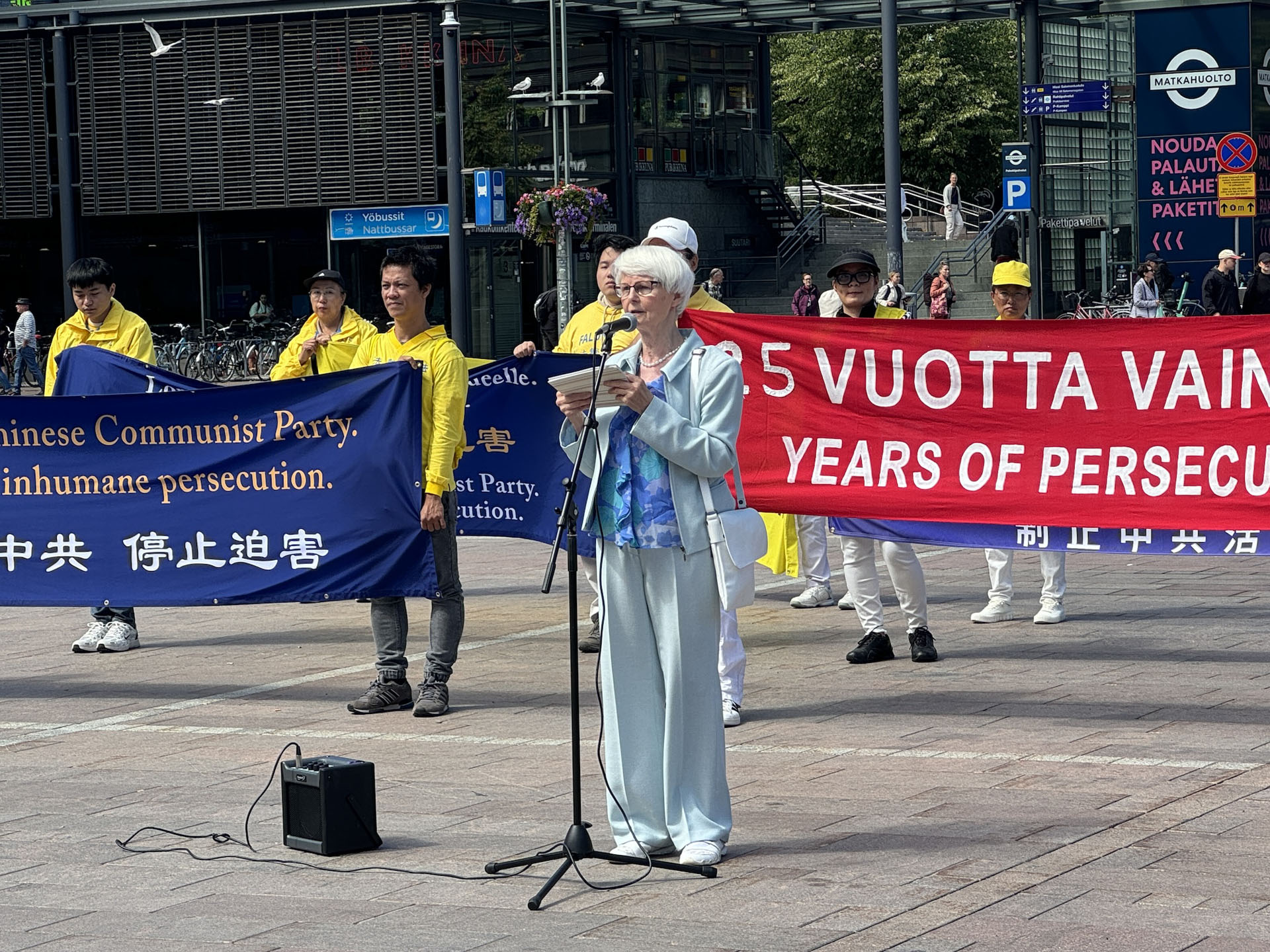 当天中午一点半时,芬兰法轮大法协会发言人希尼卡·松塔卡宁(Sinikka Suontakanen)发表演讲,部份中国法轮功学员也分享了自己以及家属在中国被迫害的经历。