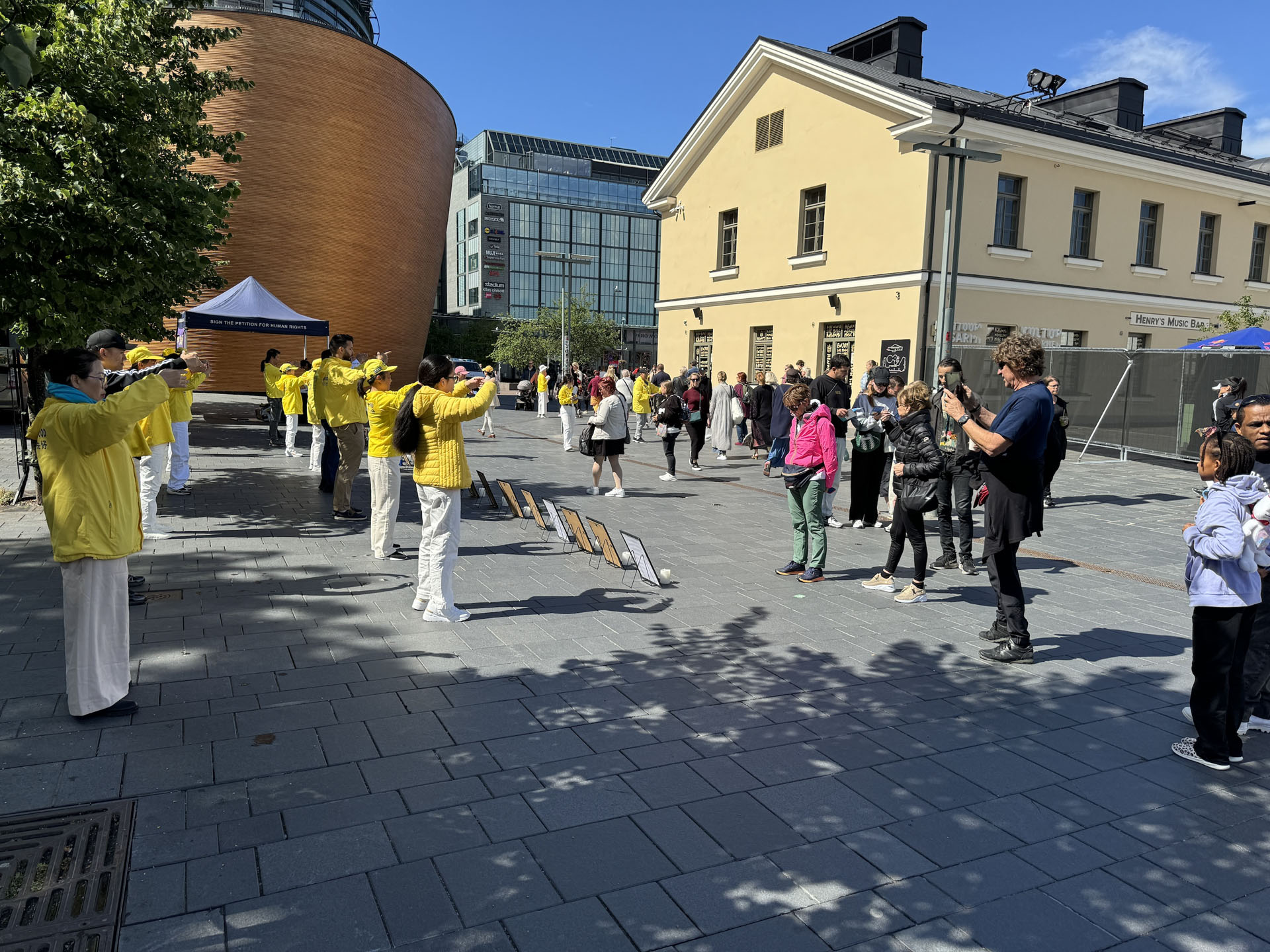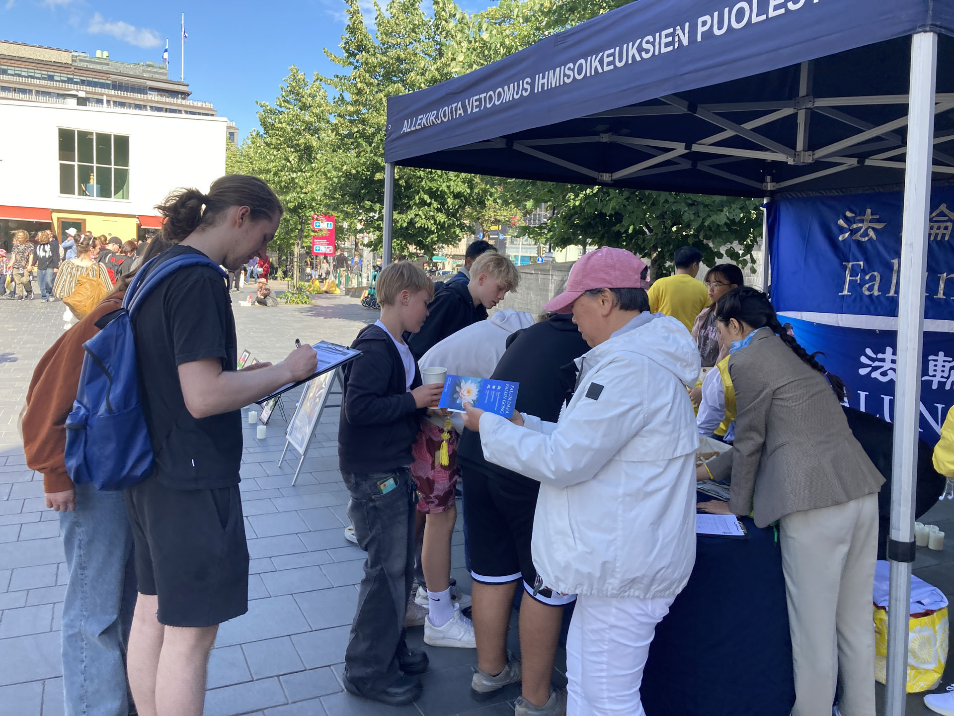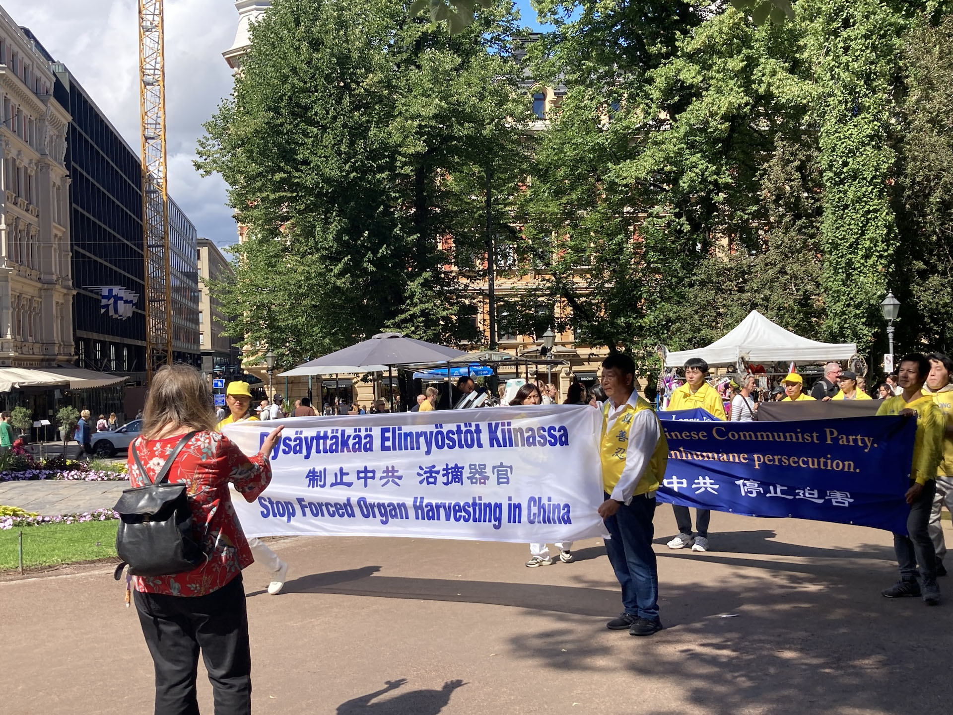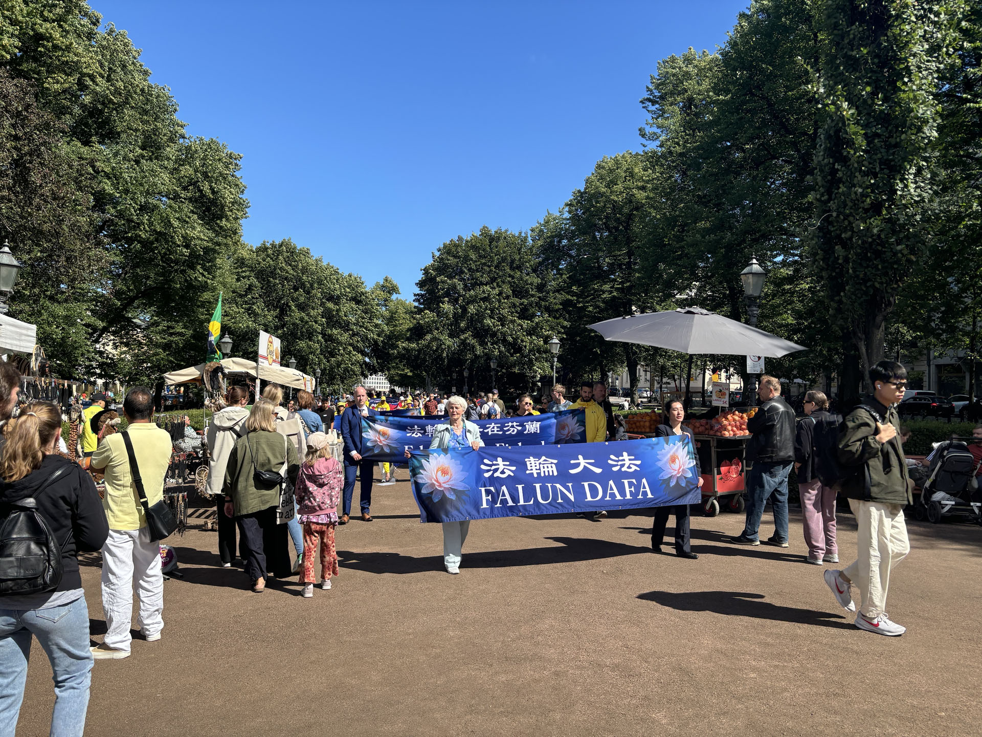 大部分芬兰人选择七月份放夏天假期,而且当天天气很好,周六赫尔辛基有很多活动,很多市民都出来逛街,享受阳光。法轮功学员的反迫害游行,吸引了很多人的注意,时不时在人群中就会听到有人大声念着“法轮大法” “法轮功”。