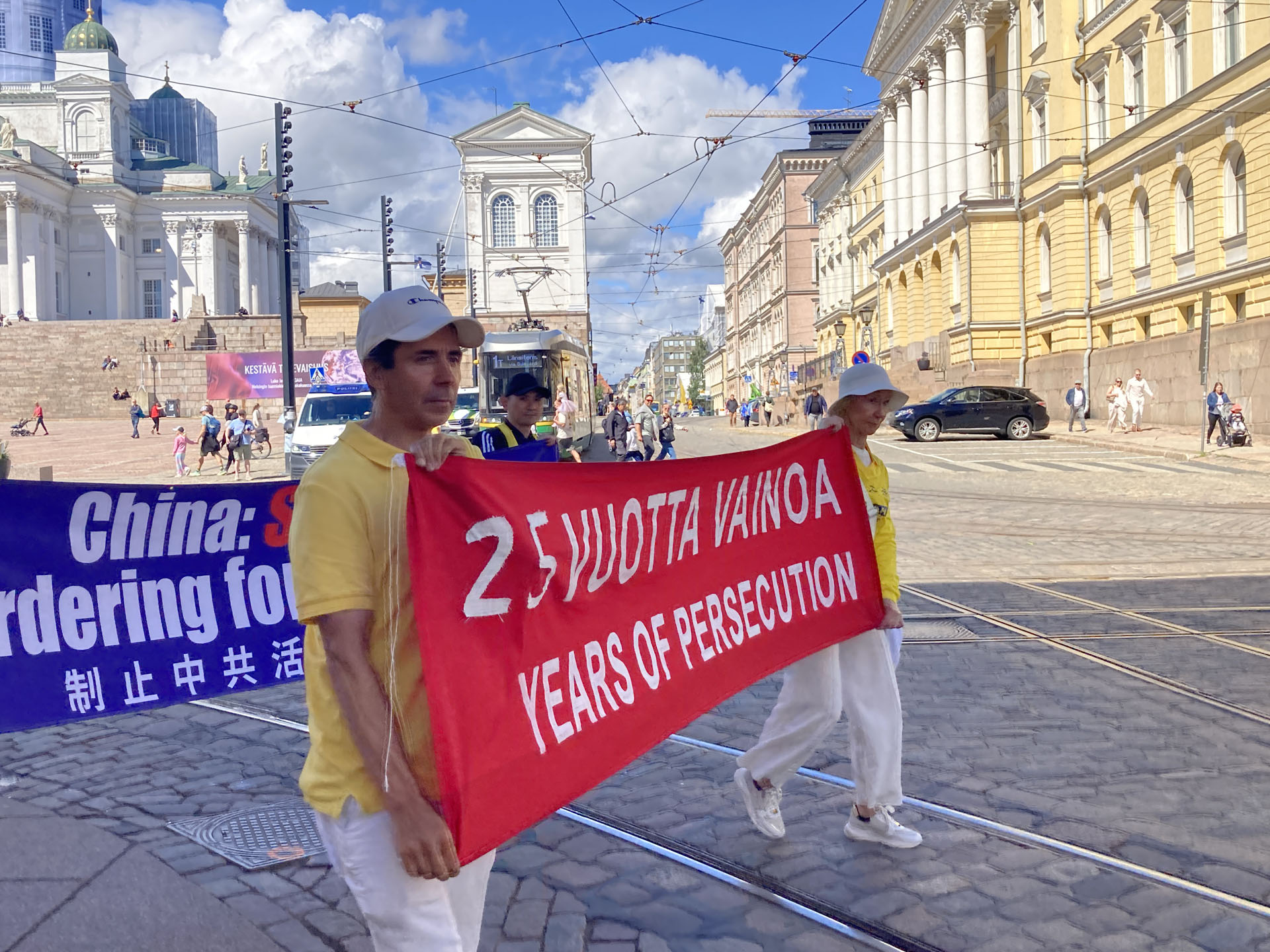 当天的游行队伍分成三个不同的主题,第一部分介绍法轮大法,主要以“法轮大法在芬兰”,“真善忍”等横幅组成。第二部份揭露中共迫害法轮功,横幅上展示了关于停止活摘器官以及悼念被中共迫害致死的法轮功学员遗像组成。第三部份是呼吁解体中共,停止迫害。