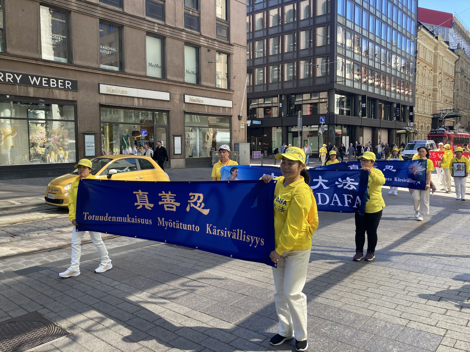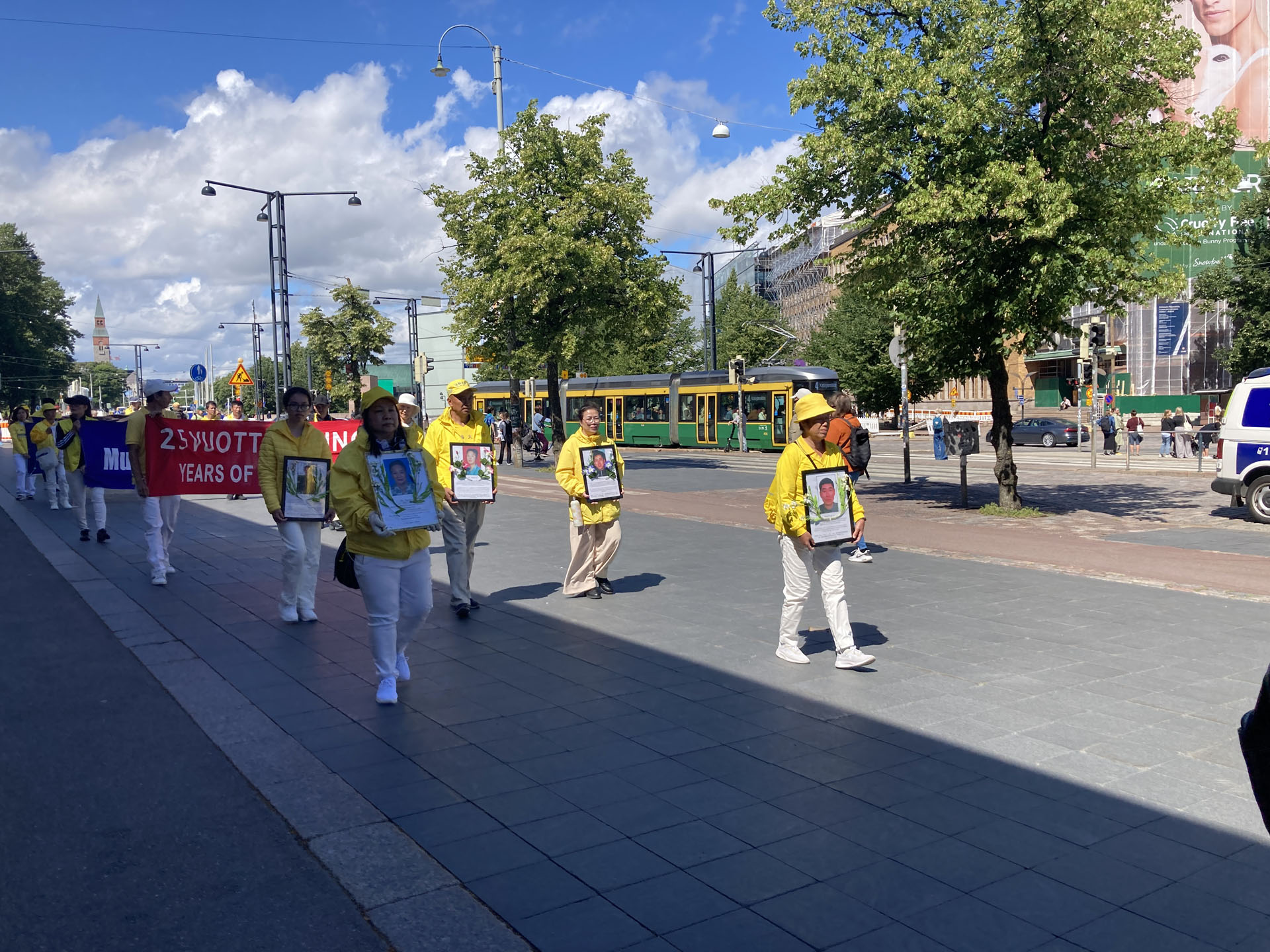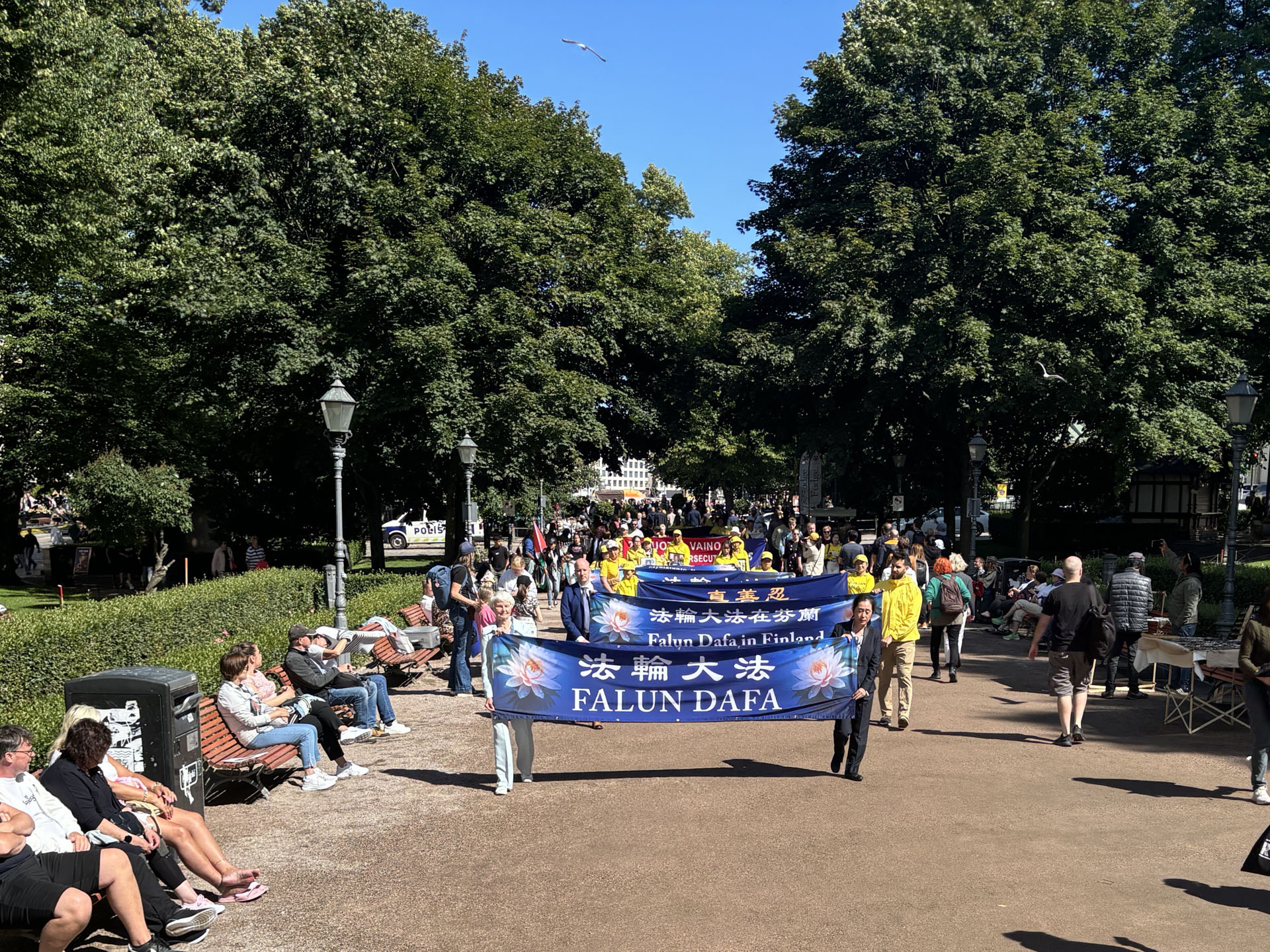 法轮功学员的游行队伍从购物中心干比出发,途经赫尔辛基的主干道曼纳海姆路(Mannerheimintie)、著名的购物中心亚历山大林卡图(Aleksanterinkatu)、赫尔辛基大教堂、北滨海艺术中心公园(Pohjoisesplanadi)等首都的地标场所,最后在芬兰国会大厦前结束。