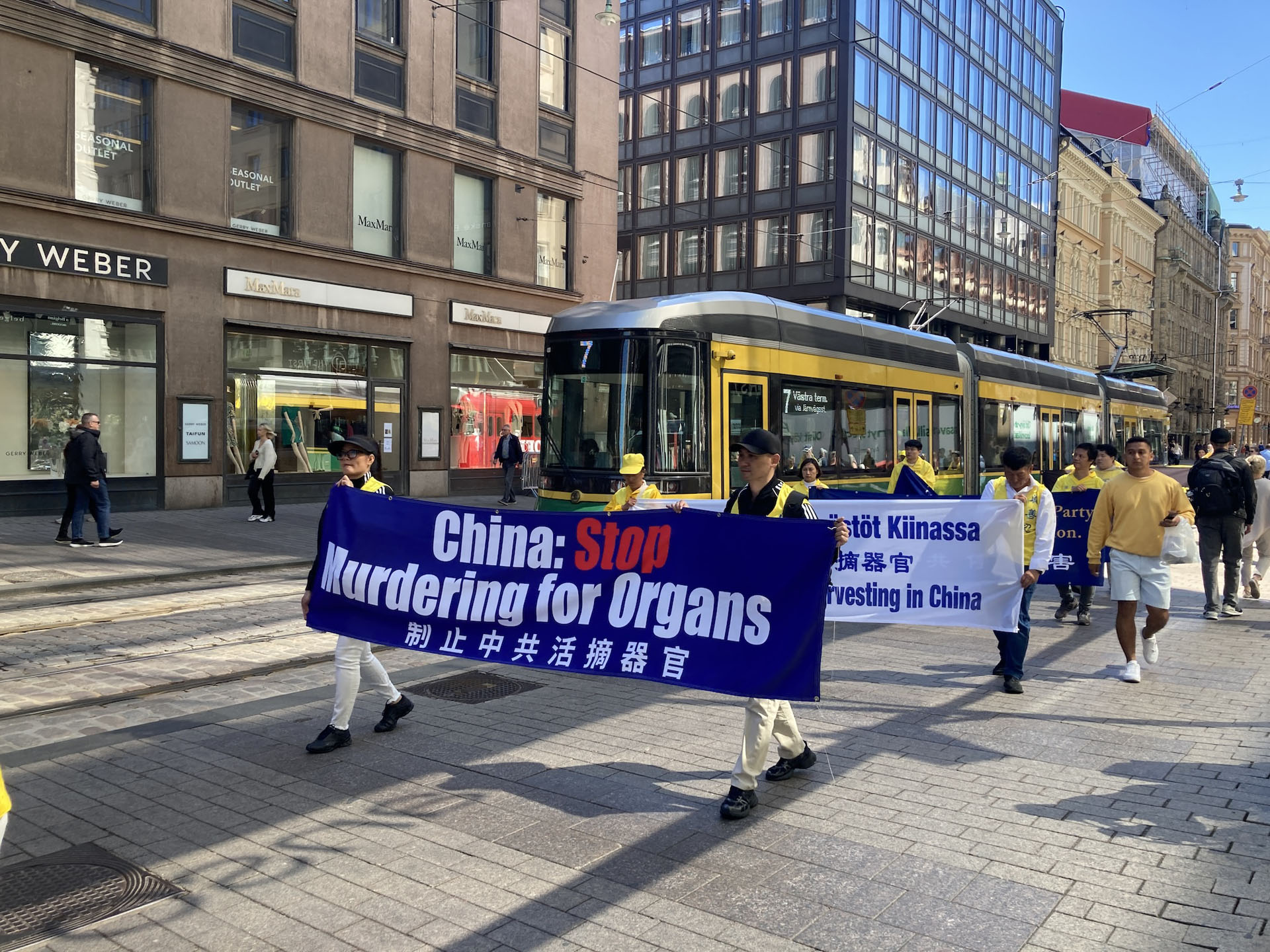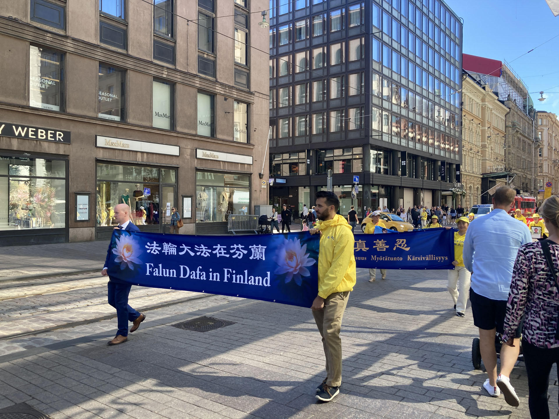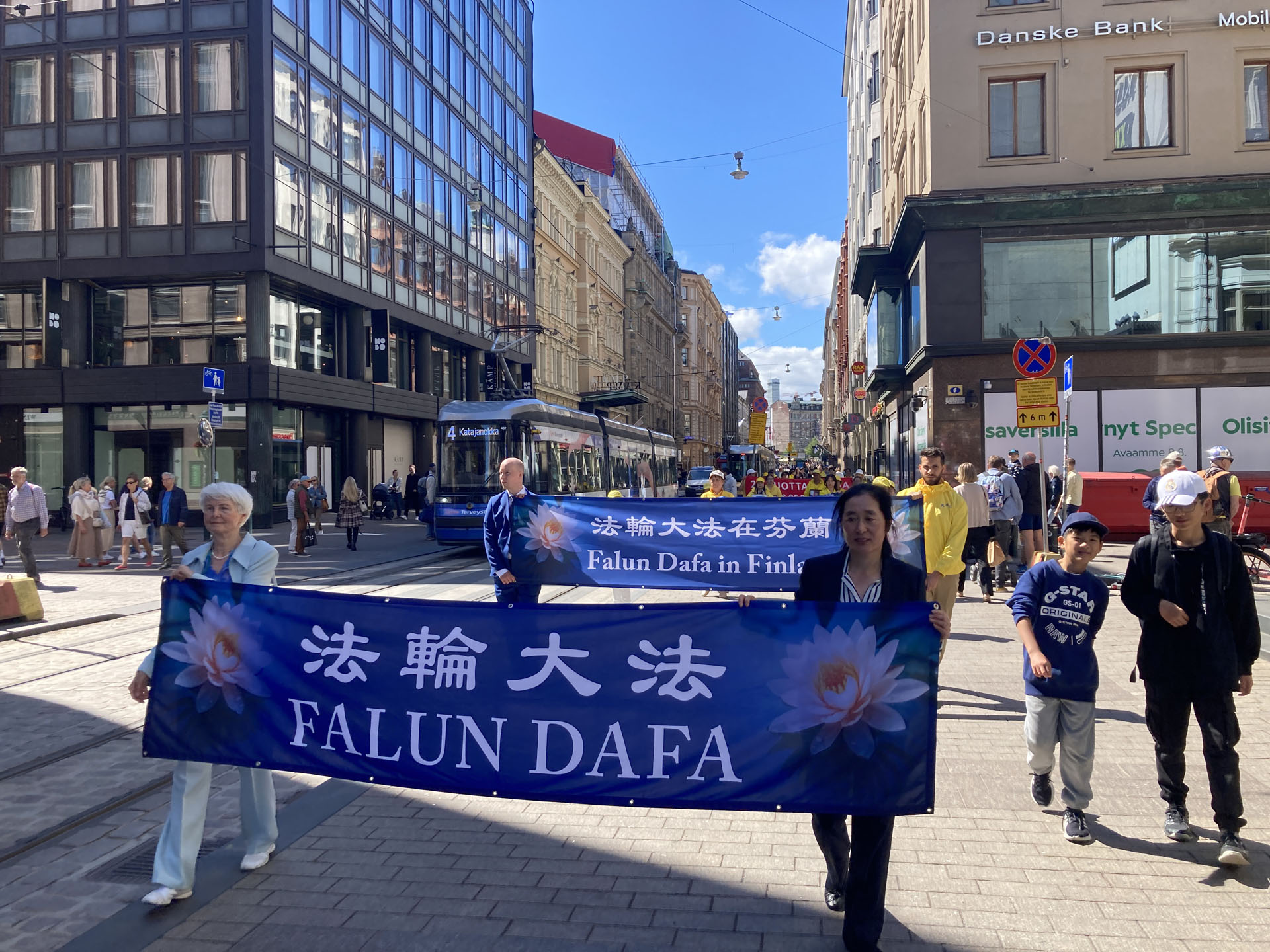 法轮功学员的游行队伍从购物中心干比出发,途经赫尔辛基的主干道曼纳海姆路(Mannerheimintie)、著名的购物中心亚历山大林卡图(Aleksanterinkatu)、赫尔辛基大教堂、北滨海艺术中心公园(Pohjoisesplanadi)等首都的地标场所,最后在芬兰国会大厦前结束。