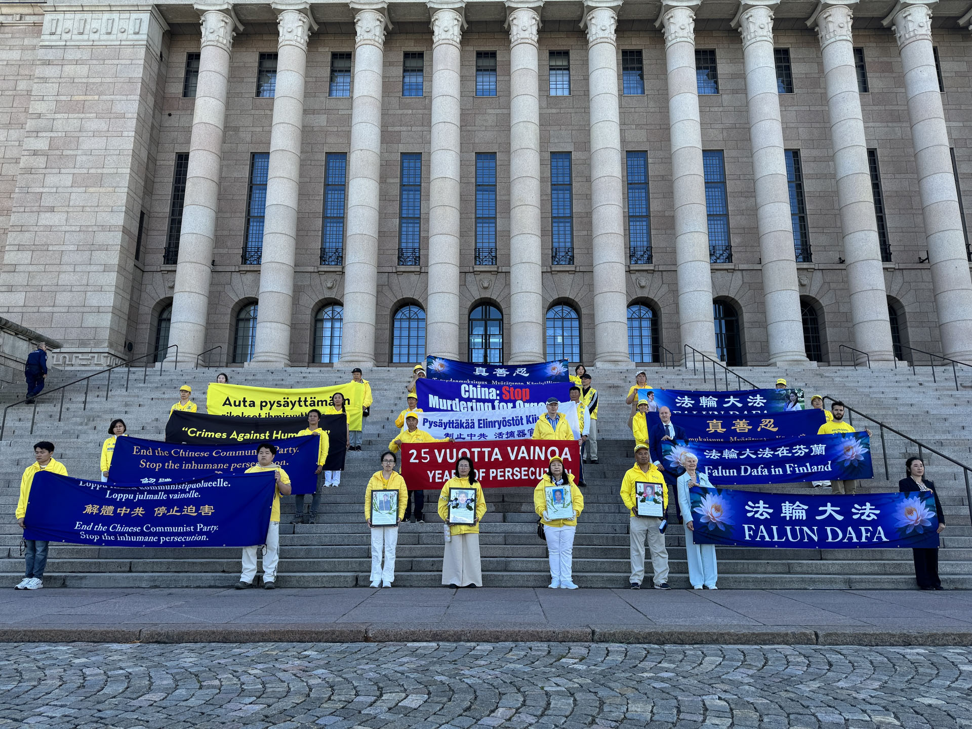 游行的终点是芬兰的国会大厦。两位女士正好从议会大楼前经过,学员告诉说今天举行法轮功二十五周年反迫害纪念日游行活动,中共活体摘取法轮功学员器官的邪恶罪行。她感到很震惊,当时眼泪都快掉下来了,走的时候对着学员双手合十表示感谢。