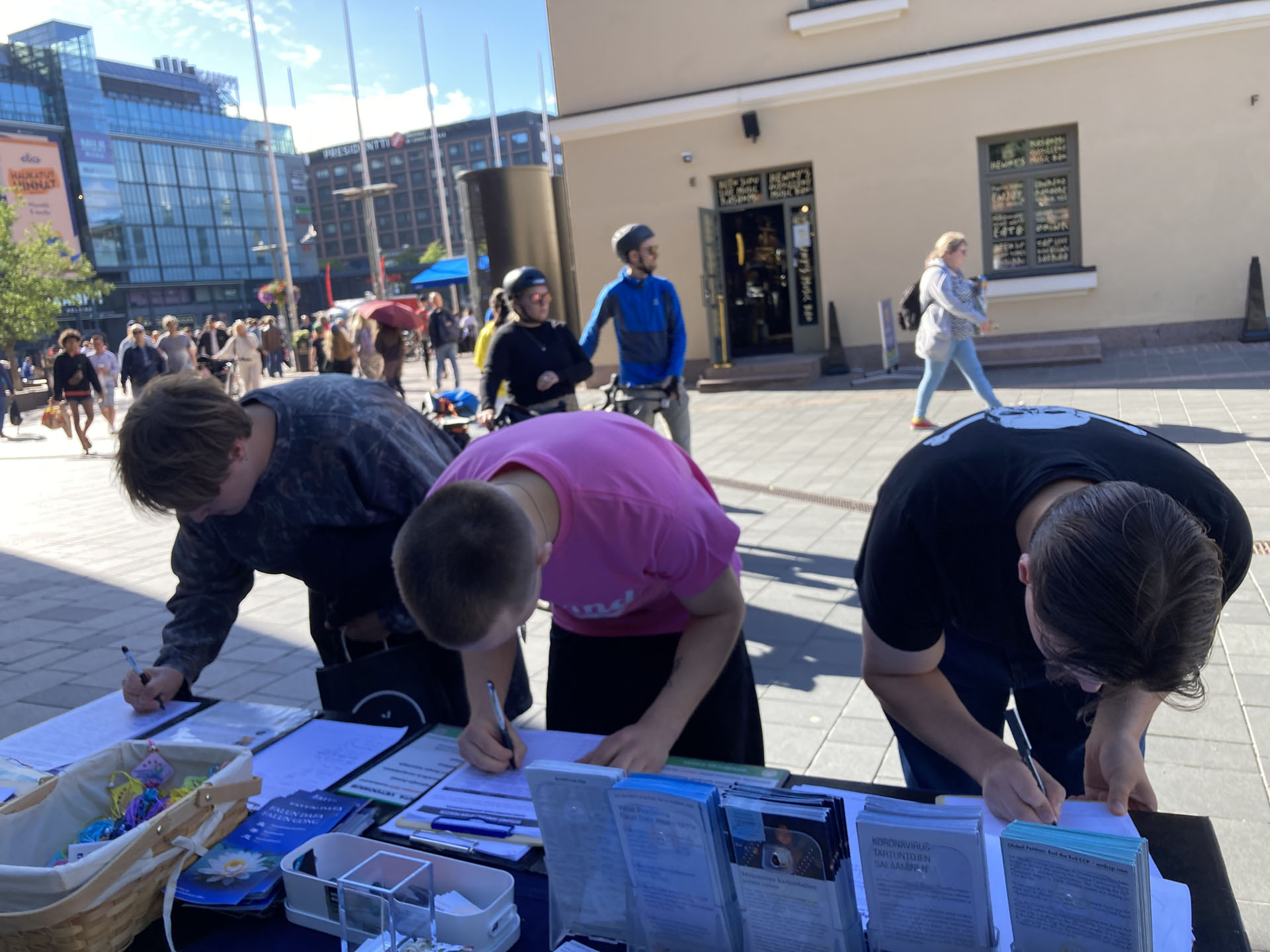 经过购物中心亚历山大林卡图(Aleksanterinkatu)时,当时车道很拥挤,一辆车正好停在路中间,开车的司机对着学员大喊:“这是怎么了?”他看着学员递给的传单后,竖着大拇子大声说:“(你们做的)这是好事!这是好事!”