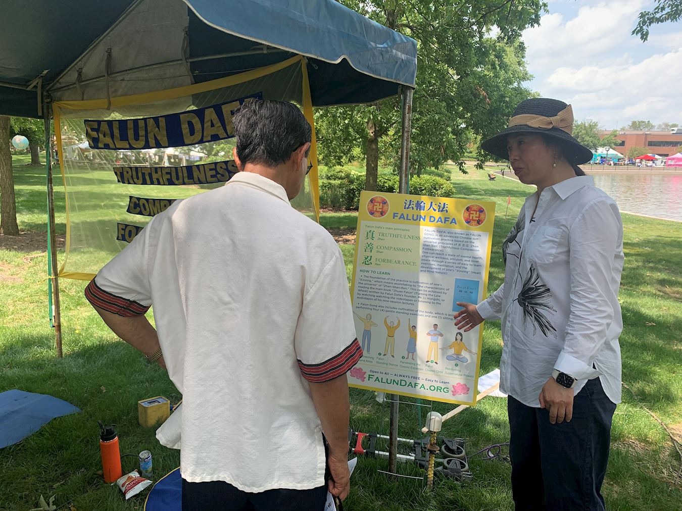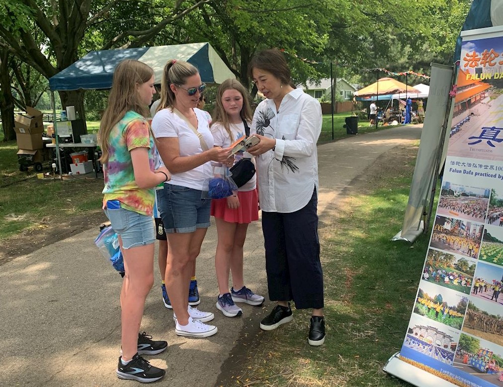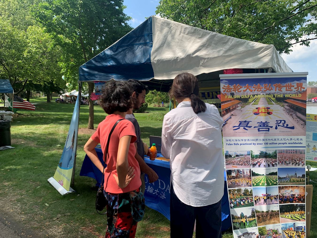 住在芝加哥北郊的妮可(Nicole)和朋友一起在参加了位于西郊的博林布鲁克市的国际文化节。妮可对佛教很感兴趣,很有兴趣想更多地了解法轮大法。她和朋友非常专注地了解了法轮大法的真、善、忍法理,祛病健身的五套功法,以及中共对法轮功的残酷迫害。她们表示非常支持法轮功学员。