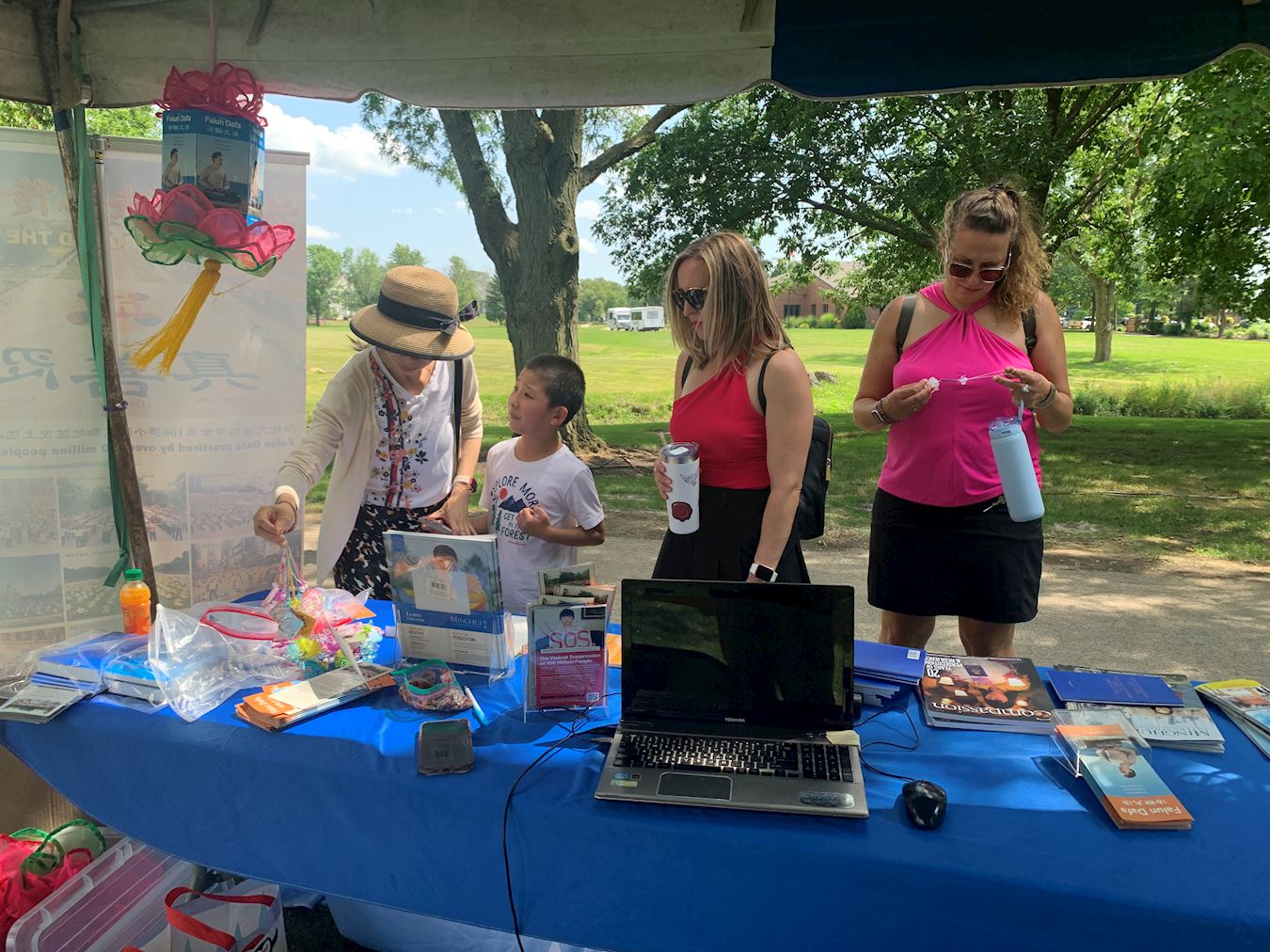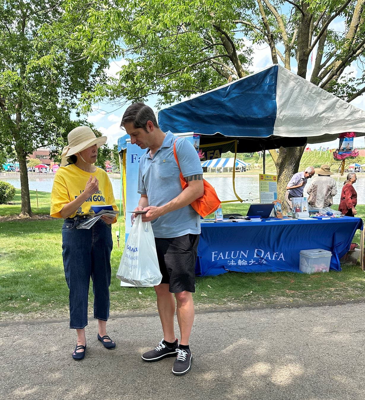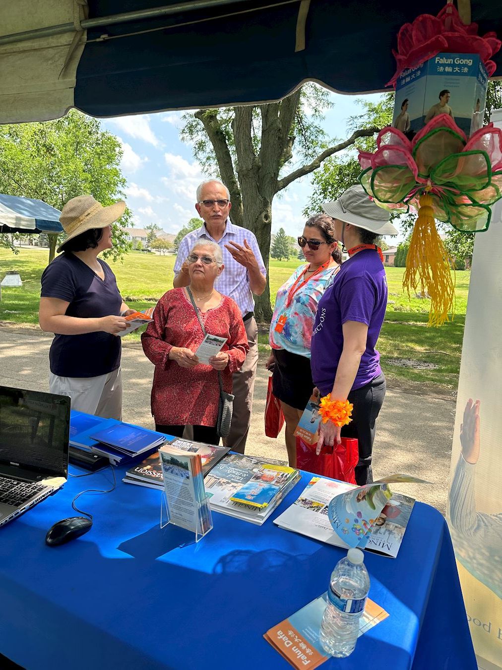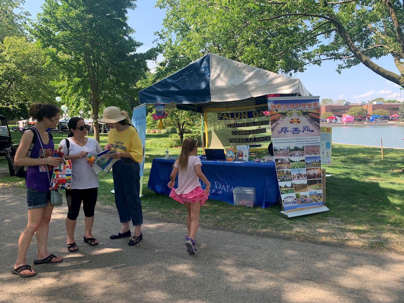 【明慧网二零二四年七月十八日】二零二四年七月十三日,法轮功学员参加了芝加哥西郊的博林布鲁克市(Bolingbrok)的国际文化节(IFest),向当地居民和游客介绍法轮大法和大法弘传全世界的盛况。很多人在现场就立刻学炼法轮功功法,还有很多人高兴地表示要去炼功点炼功。