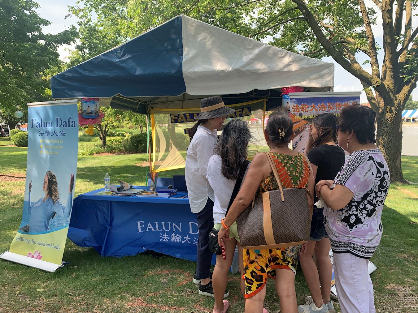 法轮功的展位吸引了络绎不绝的来自不同文化背景的民众和游客,有的人表达对学炼法轮功功法的浓厚兴趣、并且现场学炼功,有的人仔细询问法轮功炼功点的信息,还有很多人主动接过真相资料和手工制作的挂有“真、善、忍”字样的小莲花。